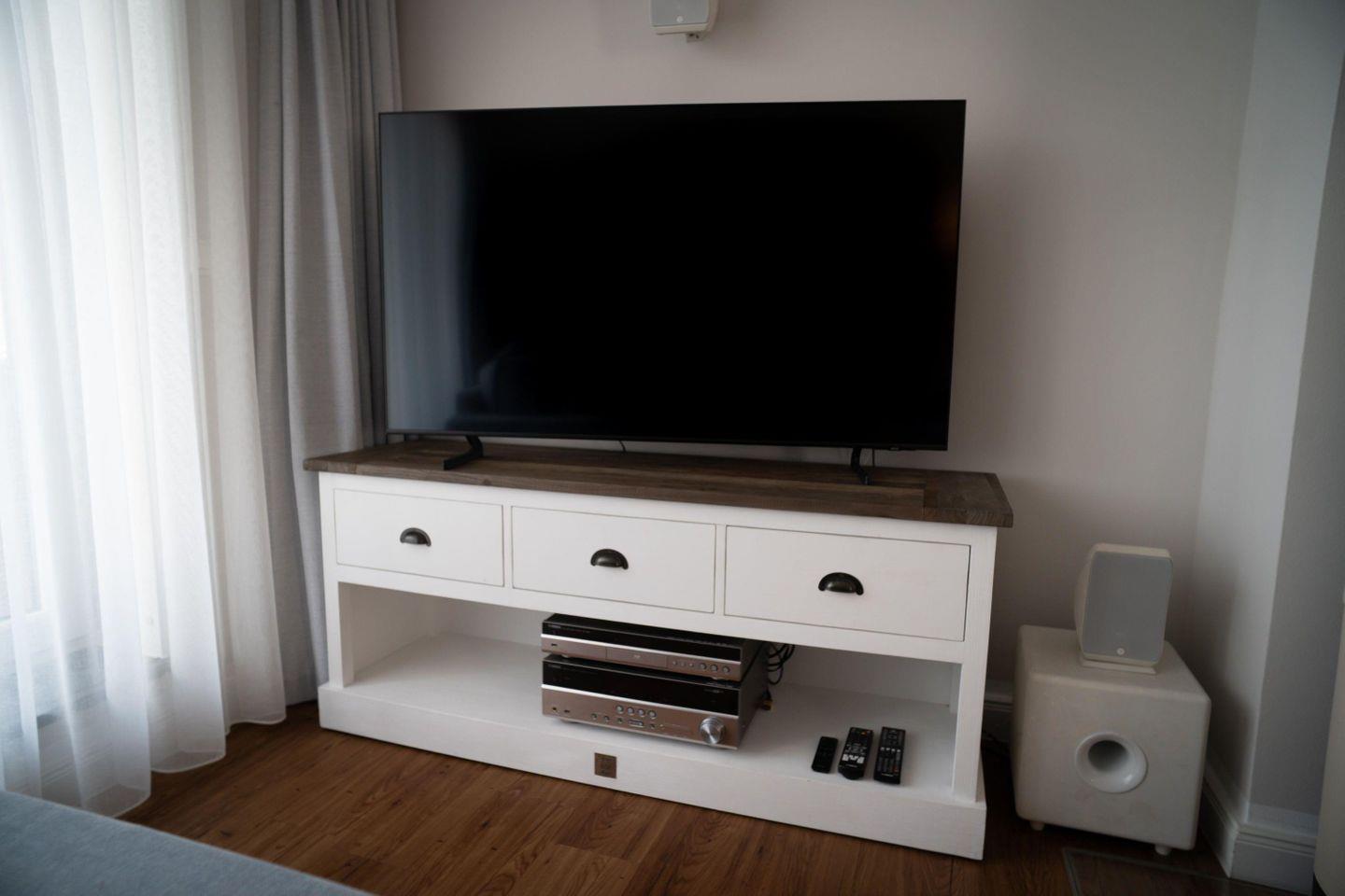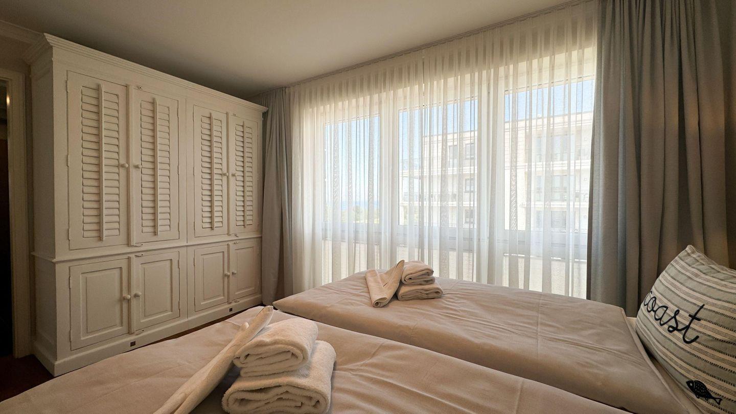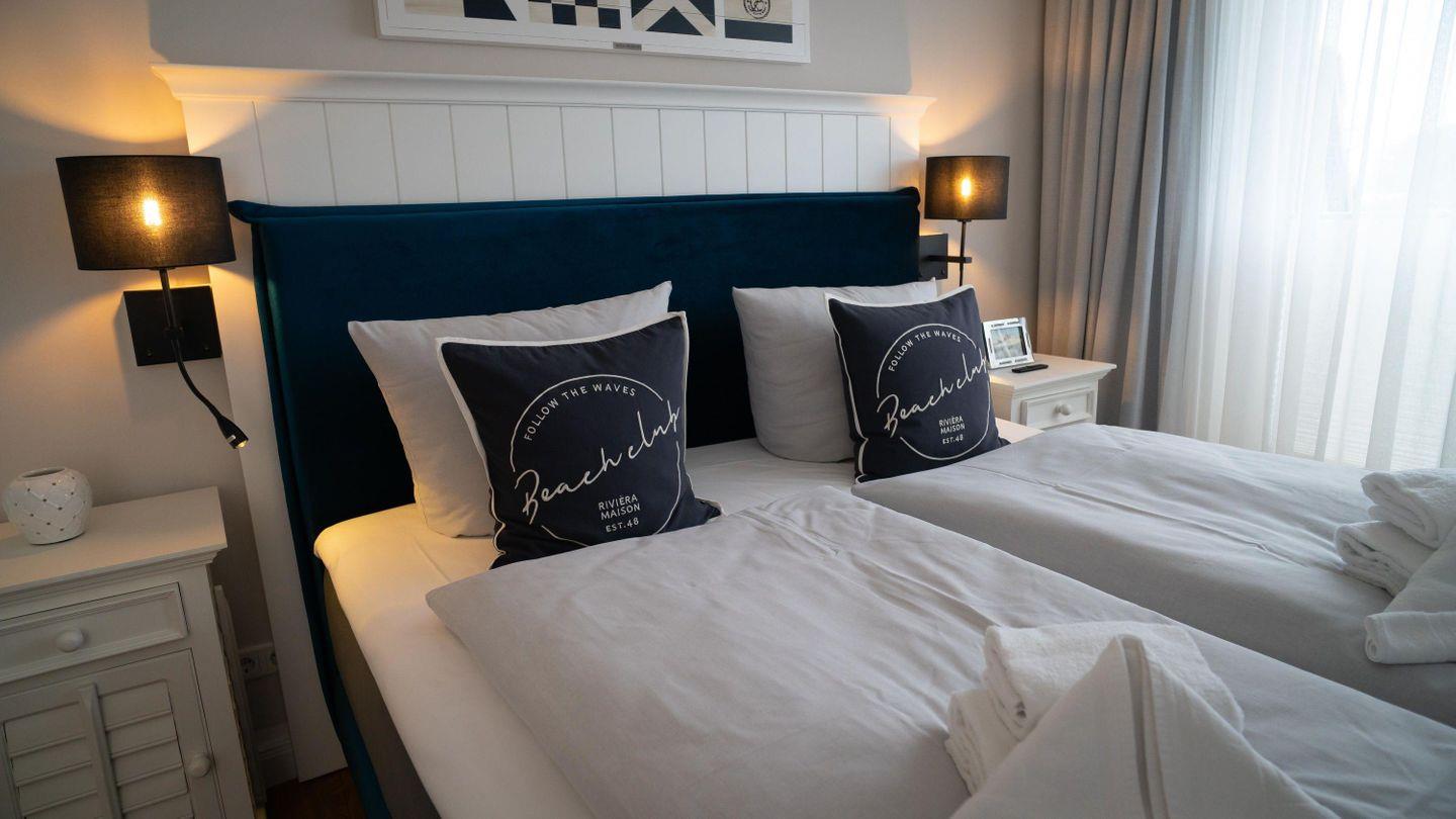 Die SCHLAFZIMMER verfügen über gemütliche Doppelbetten (180 x 200 cm /durchgehende Matratze) und geräumige Kleiderschränke. Ein separater ABSTELLRAUM bietet Stauraum für Ihre Urlaubskleidung. In einem der Schlafzimmer erwartet Sie zudem ein weiterer Flatscreen-TV. Die Ferienwohnung besticht mit einem WANNENBAD und einem DUSCHBAD mit bodengleicher Dusche. Ein Föhn und Handtuchtrockner ergänzen die Badausstattung. Auf der herrlichen DACHTERRASSE (Balkon) in Süd-Westausrichtung erwarten Sie ein traumhafter seitlicher Meerblick, ein Tisch sowie Stühle für gemeinsame Mahlzeiten an der frischen Luft. Eine SITZLOUNGE mit zwei Loungesesseln steht ebenfalls bereit. Nur 50 Meter vom Strand lässt es sich dort beim Geräusch der Wellen bestens entspannen. Eine Fußbodenheizung in allen Räumen sorgt für angenehme Wärme. Auch in den kalten Jahreszeiten.