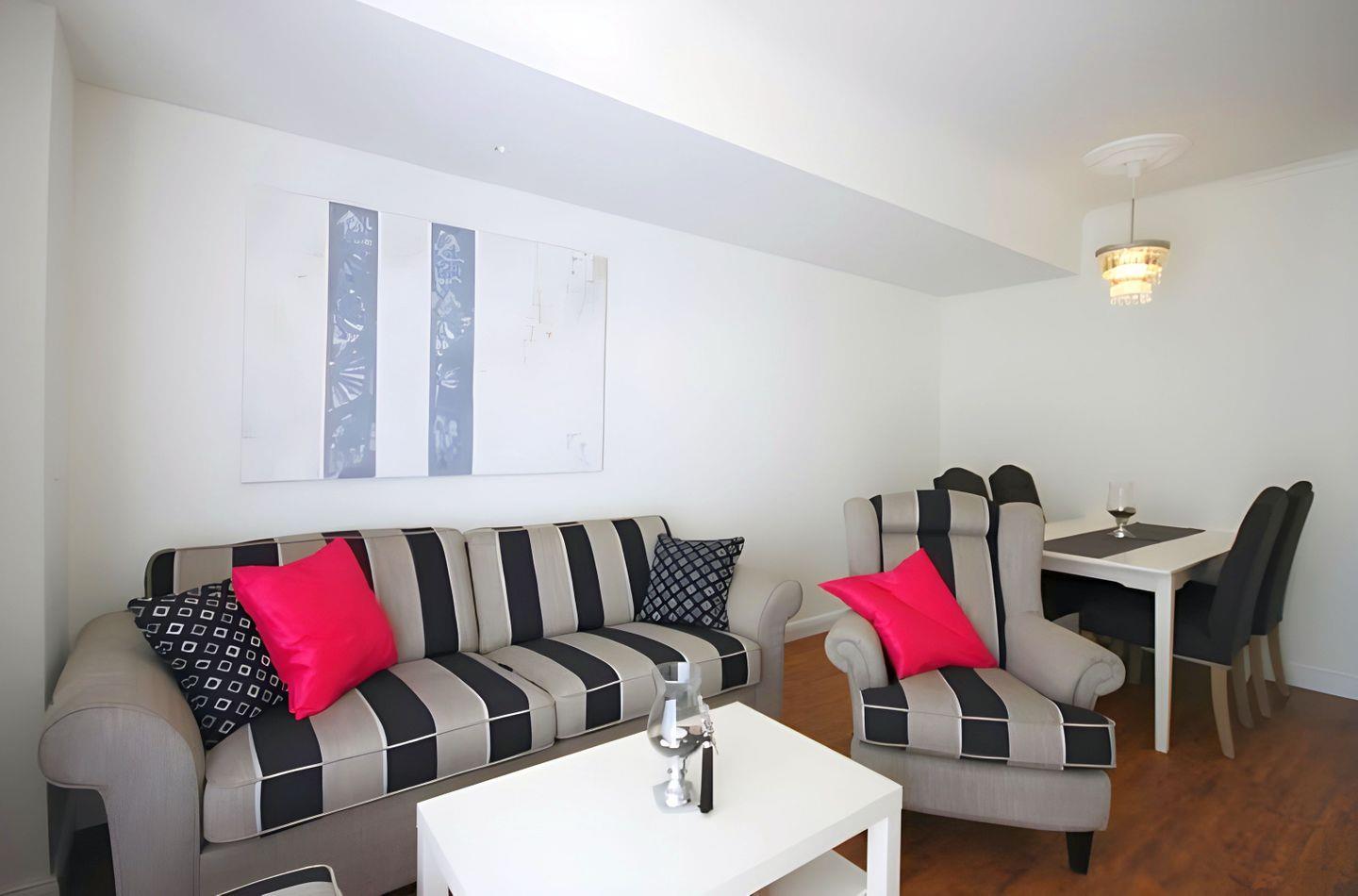 Endlich Zeit zu zweit. Es empfängt Sie der liebevoll eingerichtete WOHN/ ESSBEREICH mit einer Zweisitzer-Couch, Flatscreen-TV und einem Sessel mit Hocker. Ein großzügiger Esstisch lädt zu gemeinsamen Mahlzeiten. Die EINBAUKÜCHE ist ausgestattet mit Geschirrspüler, Kühlschrank, inklusive Gefrierfach, Kaffeemaschine, Wasserkocher, Toaster und Mikrowelle.