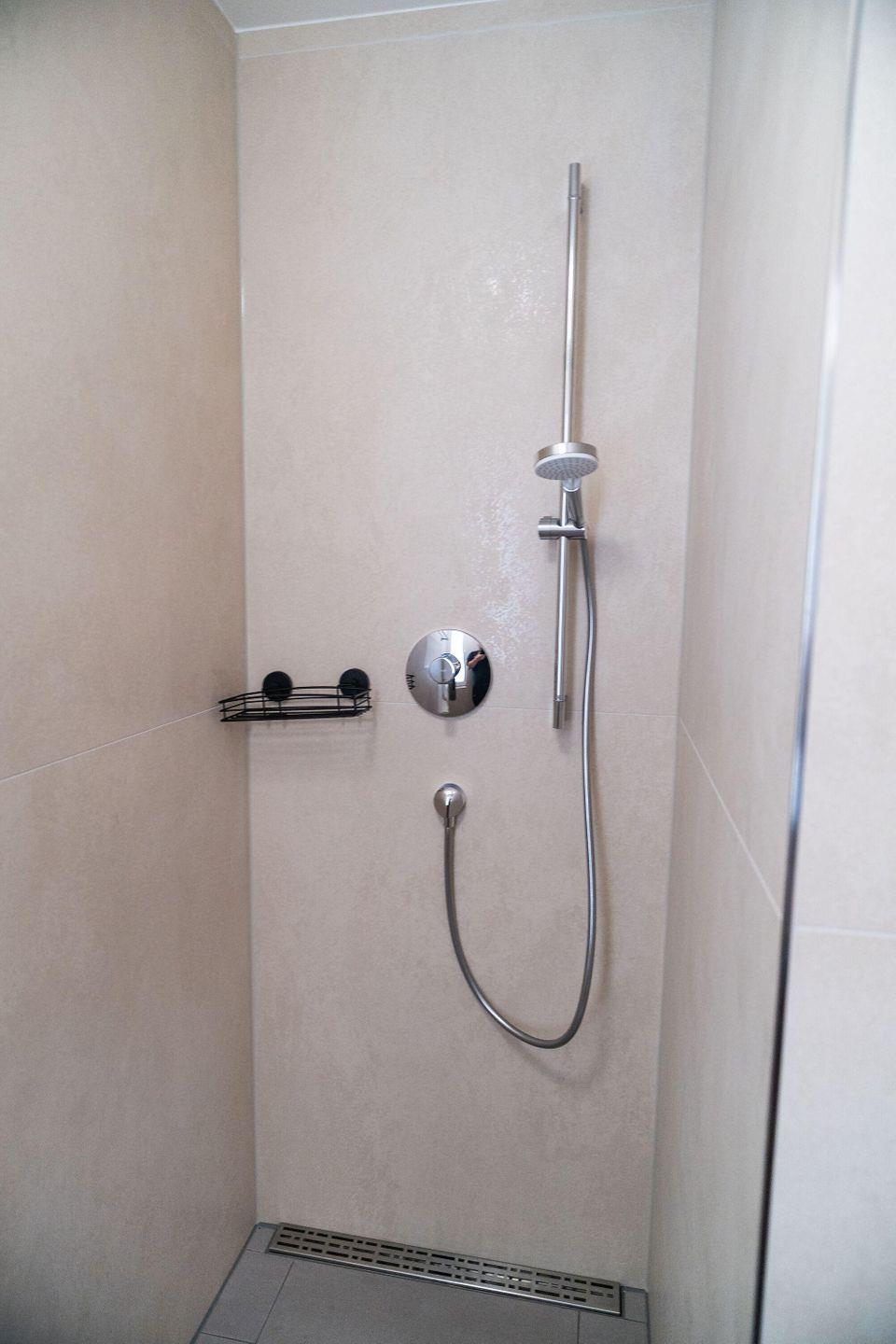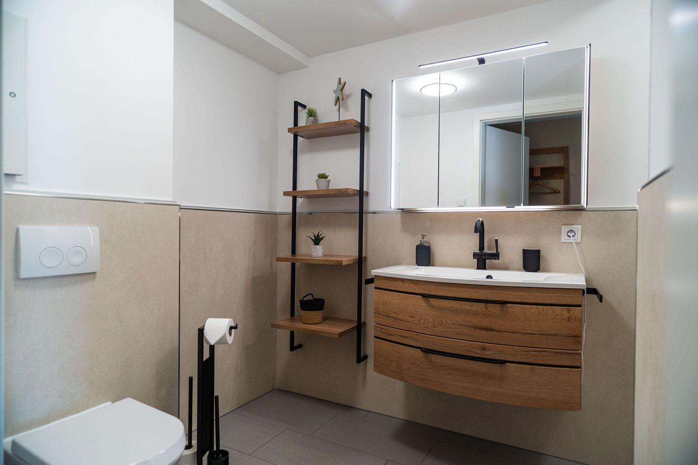 modernen Badezimmer befinden sich eine ebene Dusche sowie ein großer Spiegel und