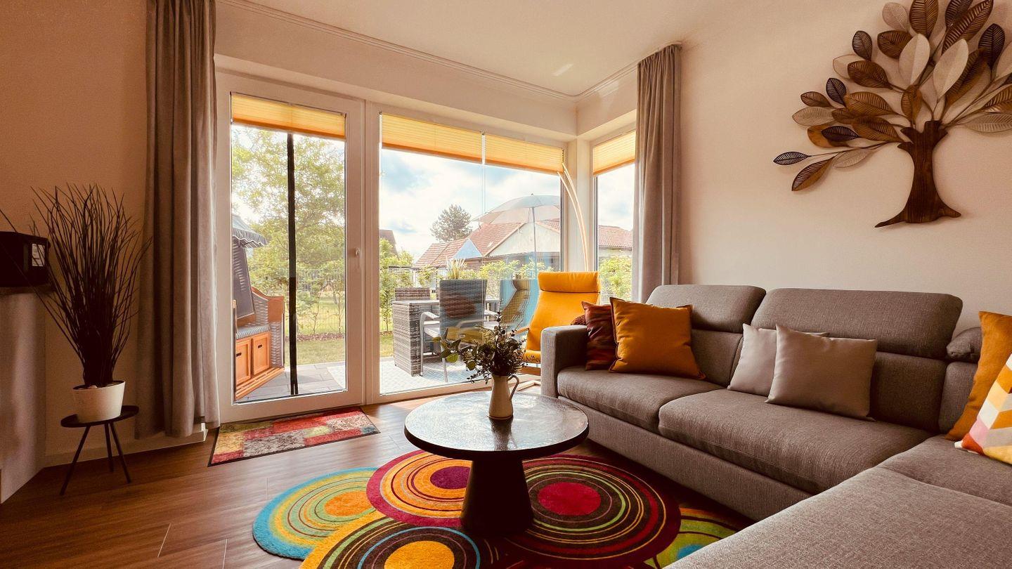 längeren Verweilen ein. Das lichtdurchflutete Wohnzimmer mit bodentiefen