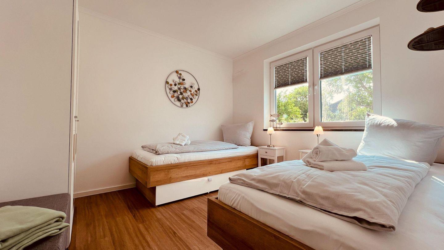 Einzelbetten (je 90 x 200 cm). In beiden Räumen ist ausreichend Stauraum
