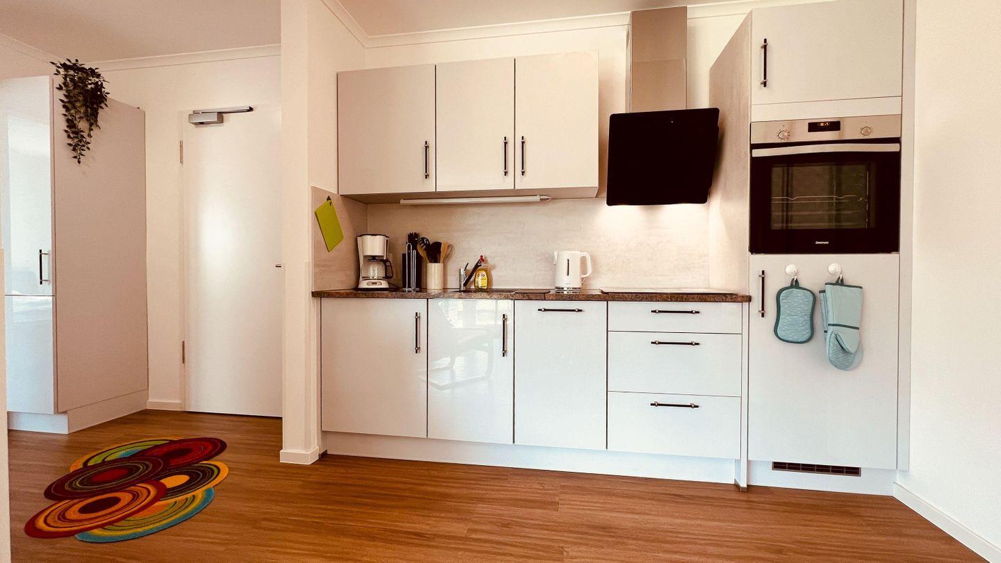 Backofen, Mikrowelle, Kühlschrank, Toaster, Wasserkocher und Kaffeemaschine.