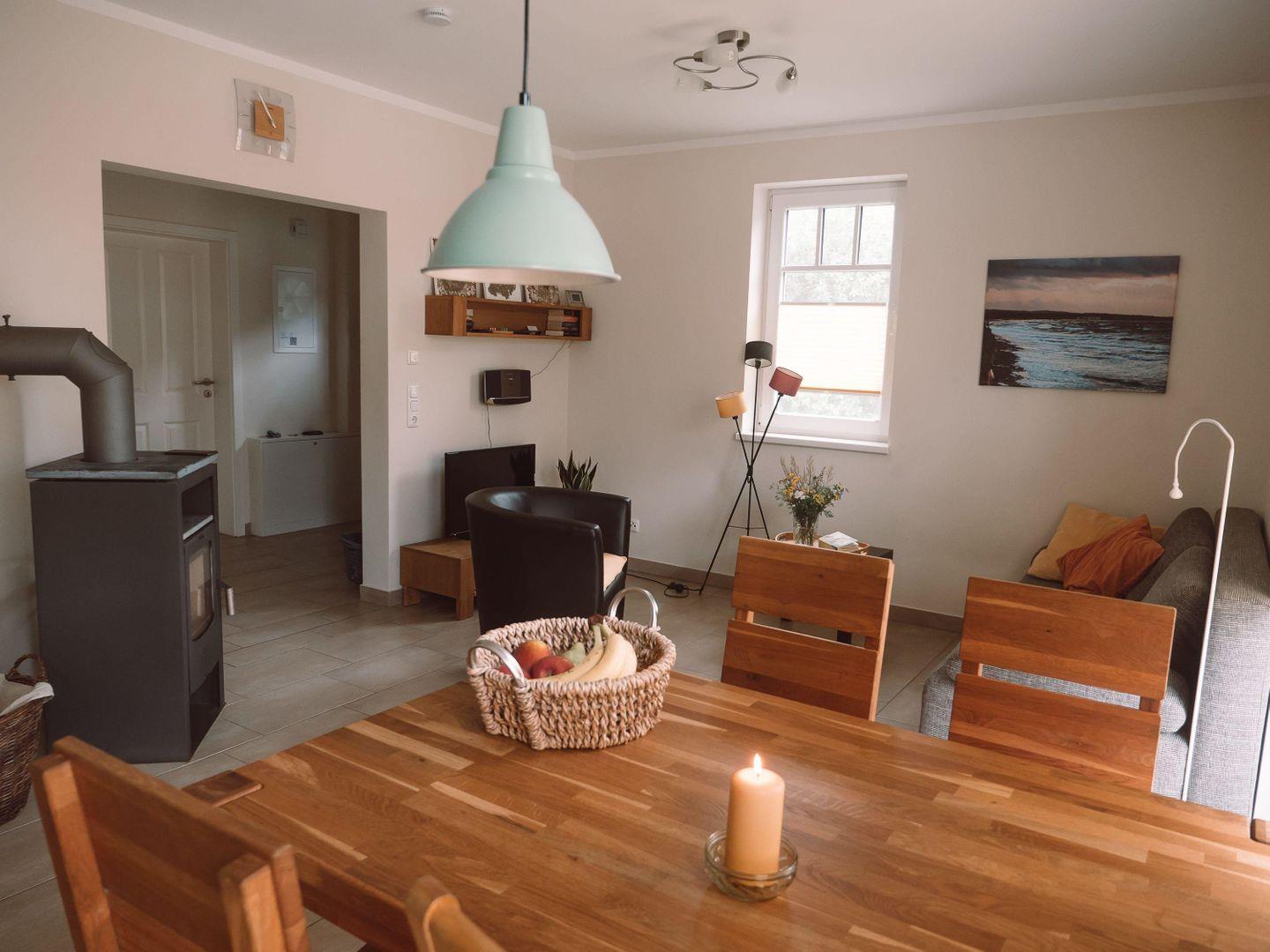 In unserem behaglichen WOHNBEREICH können Sie entspannte Stunden verbringen. Neben einem Flachbildfernseher, DVD-Player und Stereoanlage; sorgt ein KAMINOFEN für wohlige Wärme in den kühleren Jahreszeiten (Kaminholz wird nicht gestellt).