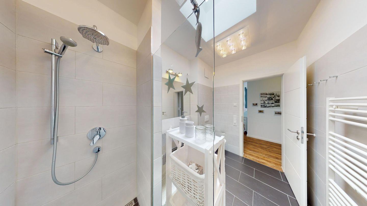 Es stehen Ihnen ein elegantes Wohlfühl-Duschbad mit bodengleicher Dusche zur