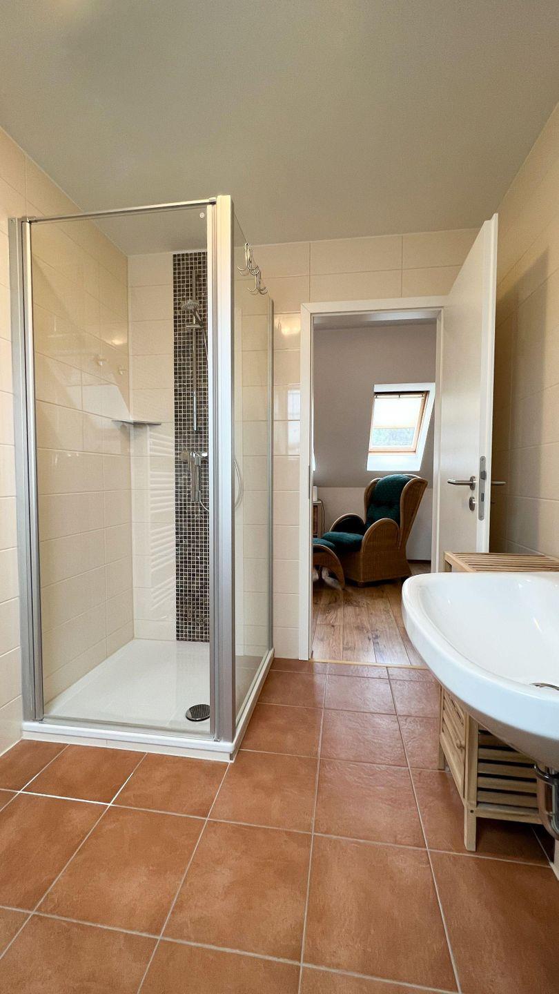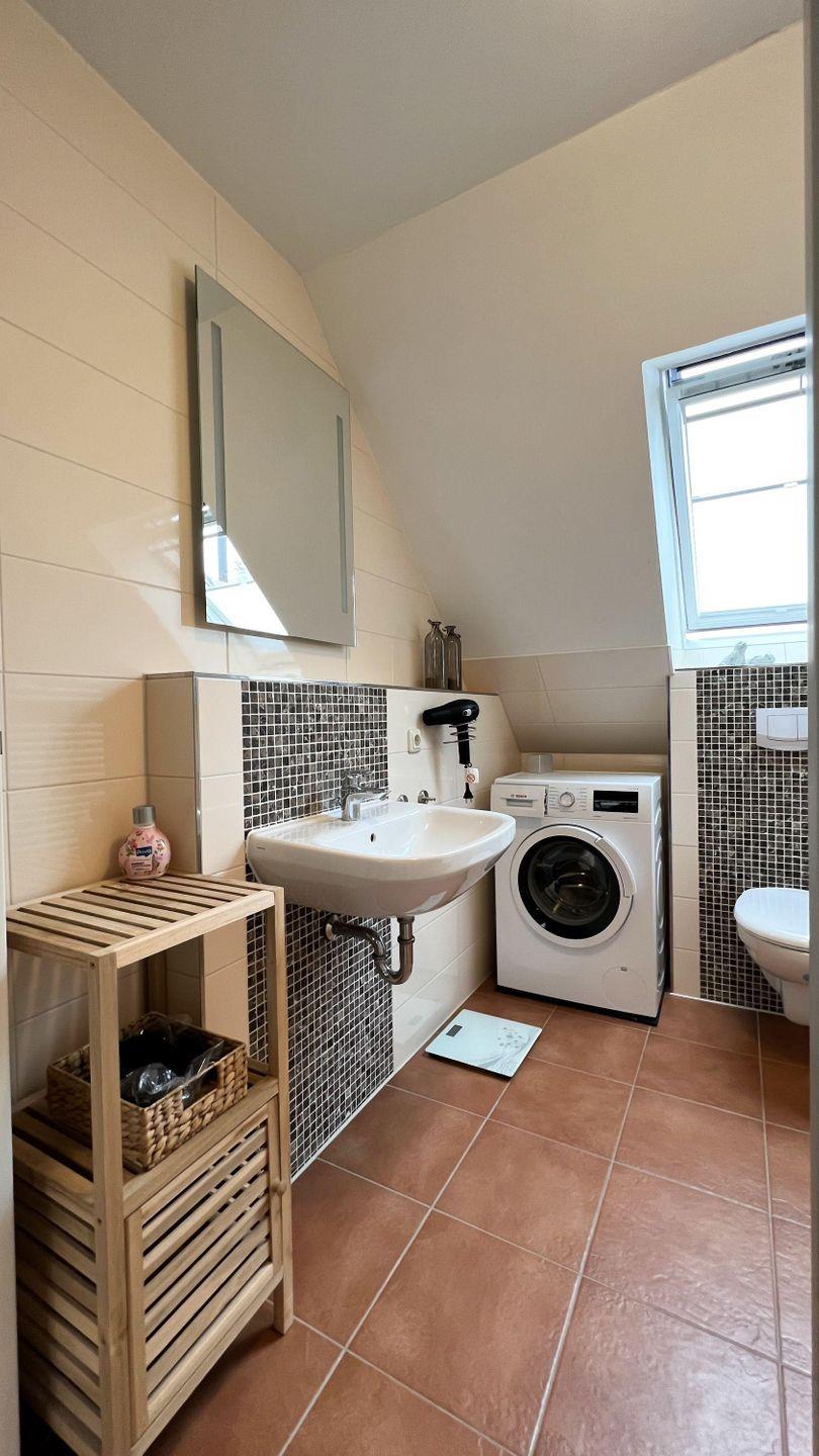 Tageslichtbad mit Waschmaschine und Regendusche rundet das Gesamtbild ab.