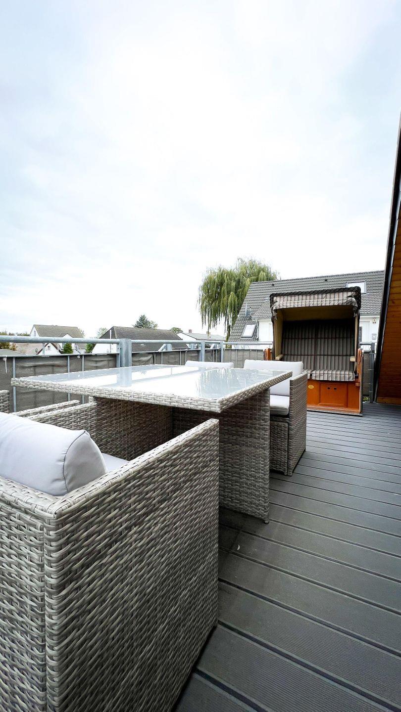 auf eine großzügige Dachterrasse, die mit einem gemütlichen Strandkorb zum