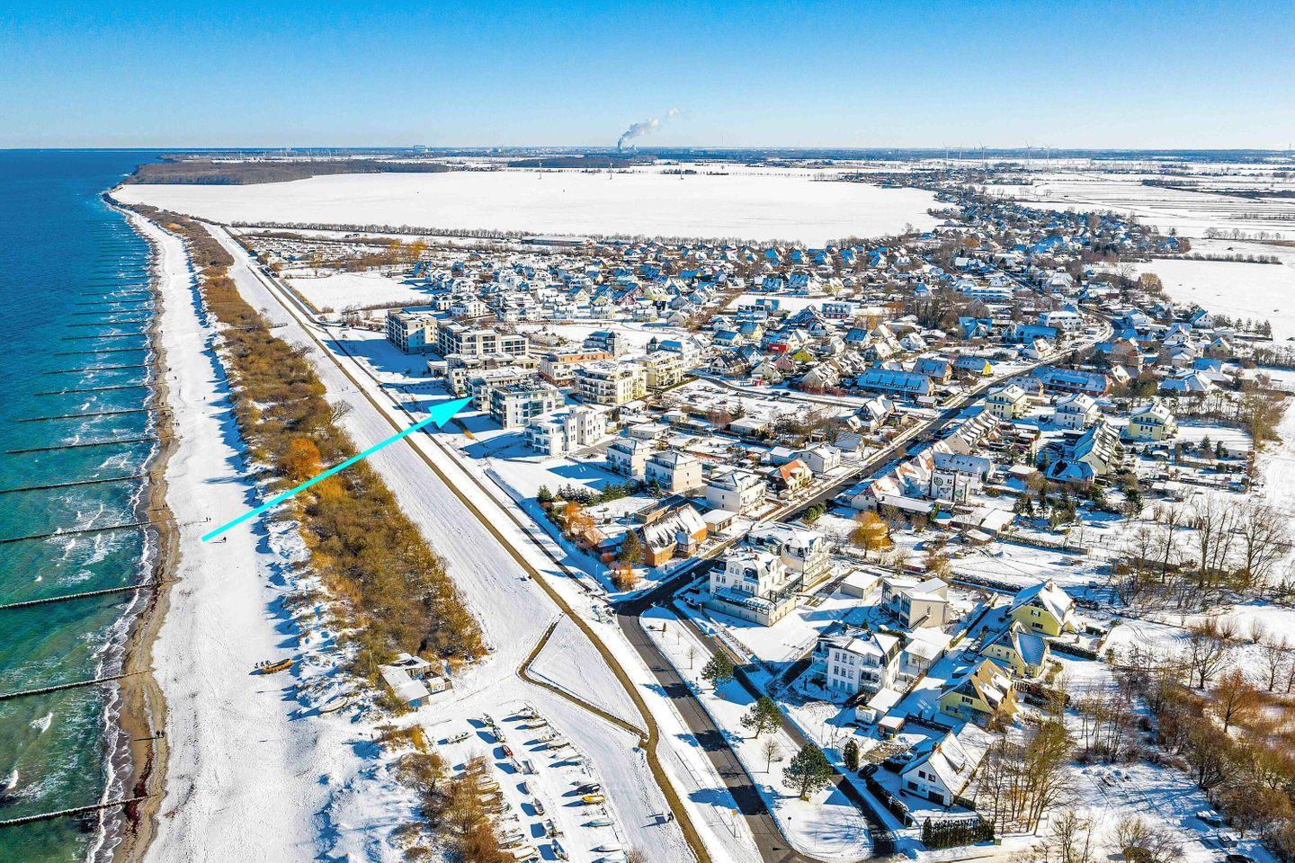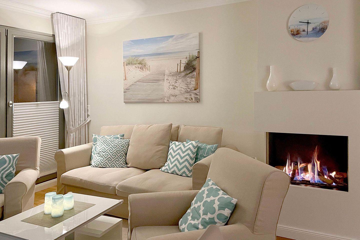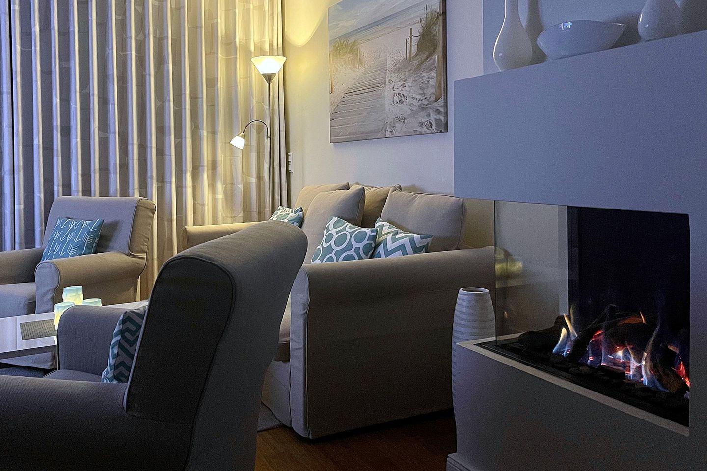 Ein weiteres stimmungsvolles Highlight ist der gut nutzbare Gas-Kamin. Der Bereich erstreckt sich über eine komplett eingerichtete KÜCHENZEILE und einen Esstisch mit fünf Stühlen für gemeinsame Mahlzeiten und gesellige Spieleabende. Die integrierte Induktionsherdplatte (4-Kochstellen) sorgt für eine schnellere Zubereitung Ihrer Gerichte. Weiterhin stehen ein Backofen, Geschirrspüler, Kühlschrank mit Gefrierfach, Mikrowelle, Kaffeemaschine, „Nespressomaschine“, Wasserkocher und Toaster zur Verfügung. Es ist für ausreichende Abstell- und Unterbringungsmöglichkeiten gesorgt. Über den Wohnbereich gelangen Sie auf den herrlichen Balkon in Nord-Ausrichtung mit traumhaftem Ostseeblick. Im vorhandenen Strandkorb können Sie fantastische Sonnenuntergänge genießen. Die verbaute Fußbodenheizung sorgt in allen Räumen stets für wohlige Wärme.