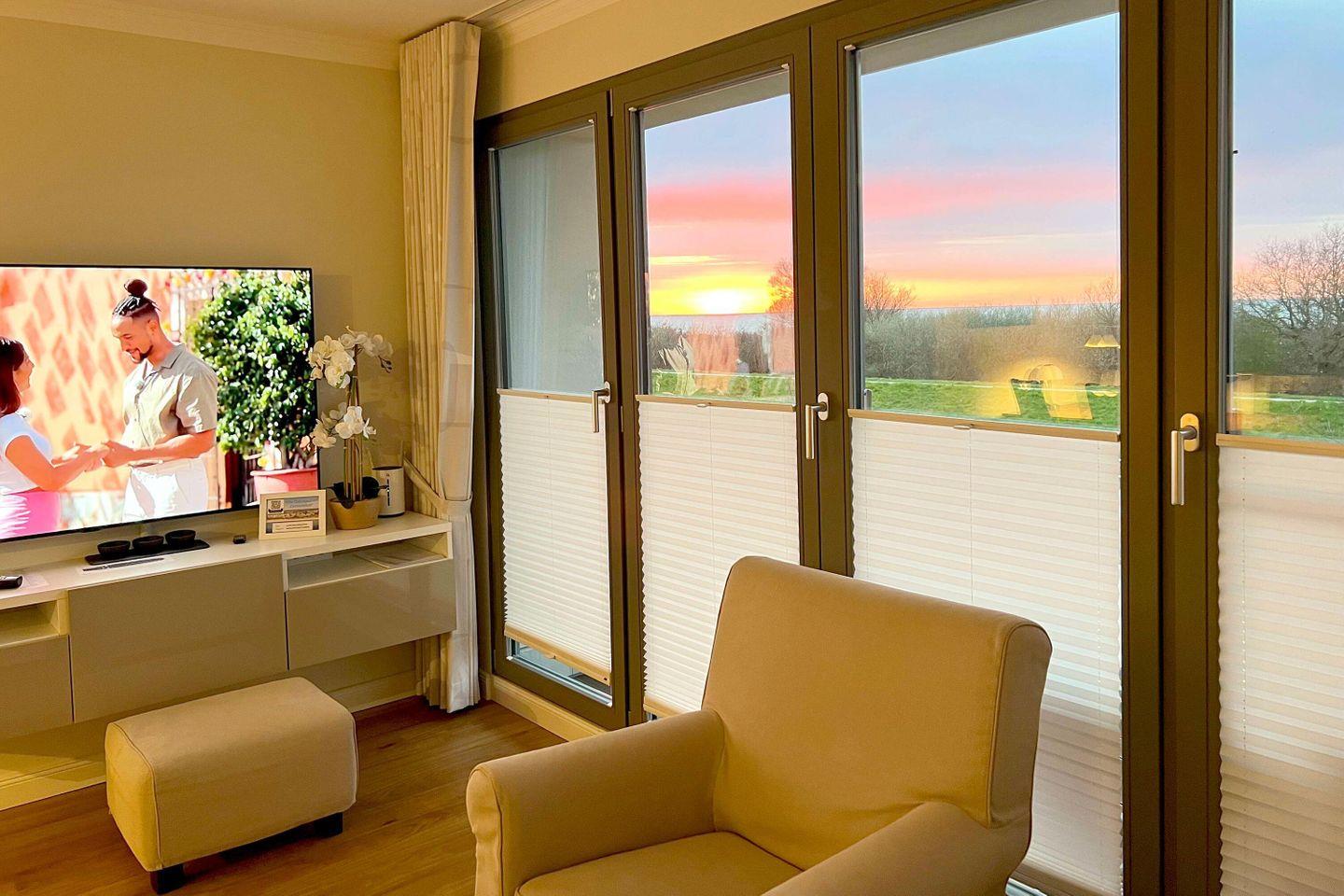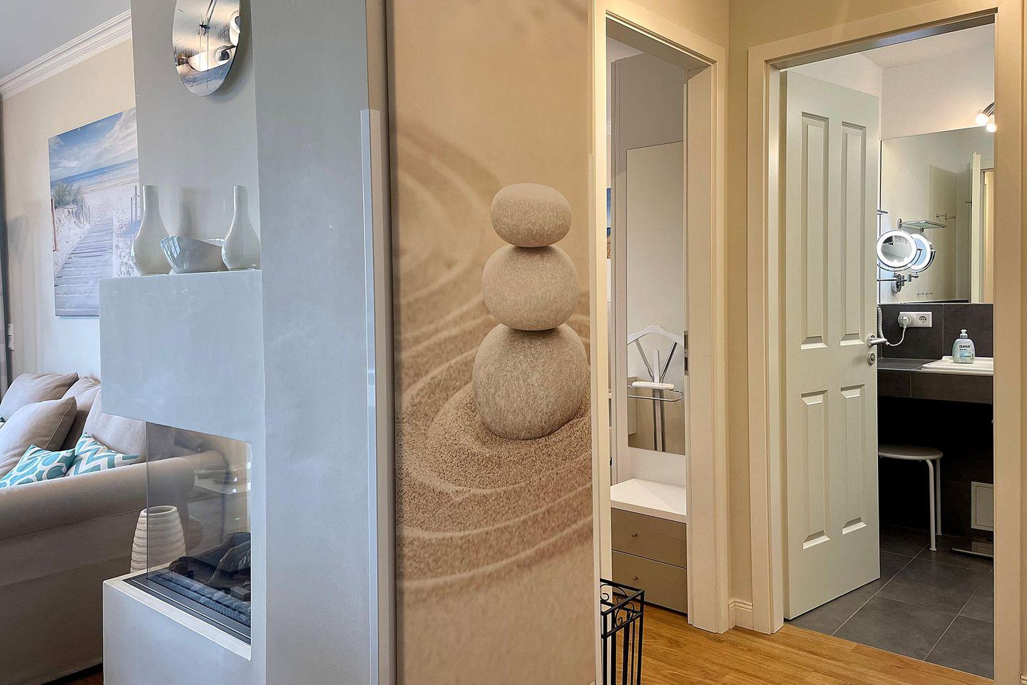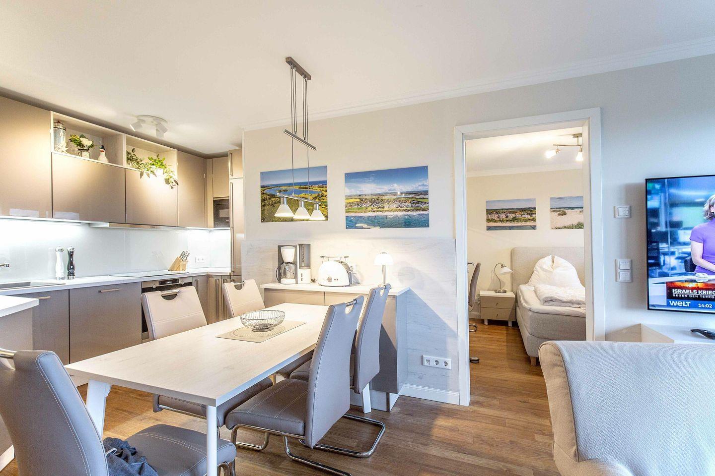 Ein weiteres stimmungsvolles Highlight ist der gut nutzbare Gas-Kamin. Der Bereich erstreckt sich über eine komplett eingerichtete KÜCHENZEILE und einen Esstisch mit fünf Stühlen für gemeinsame Mahlzeiten und gesellige Spieleabende. Die integrierte Induktionsherdplatte (4-Kochstellen) sorgt für eine schnellere Zubereitung Ihrer Gerichte. Weiterhin stehen ein Backofen, Geschirrspüler, Kühlschrank mit Gefrierfach, Mikrowelle, Kaffeemaschine, „Nespressomaschine“, Wasserkocher und Toaster zur Verfügung. Es ist für ausreichende Abstell- und Unterbringungsmöglichkeiten gesorgt. Über den Wohnbereich gelangen Sie auf den herrlichen Balkon in Nord-Ausrichtung mit traumhaftem Ostseeblick. Im vorhandenen Strandkorb können Sie fantastische Sonnenuntergänge genießen. Die verbaute Fußbodenheizung sorgt in allen Räumen stets für wohlige Wärme.