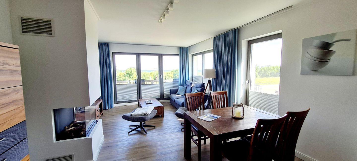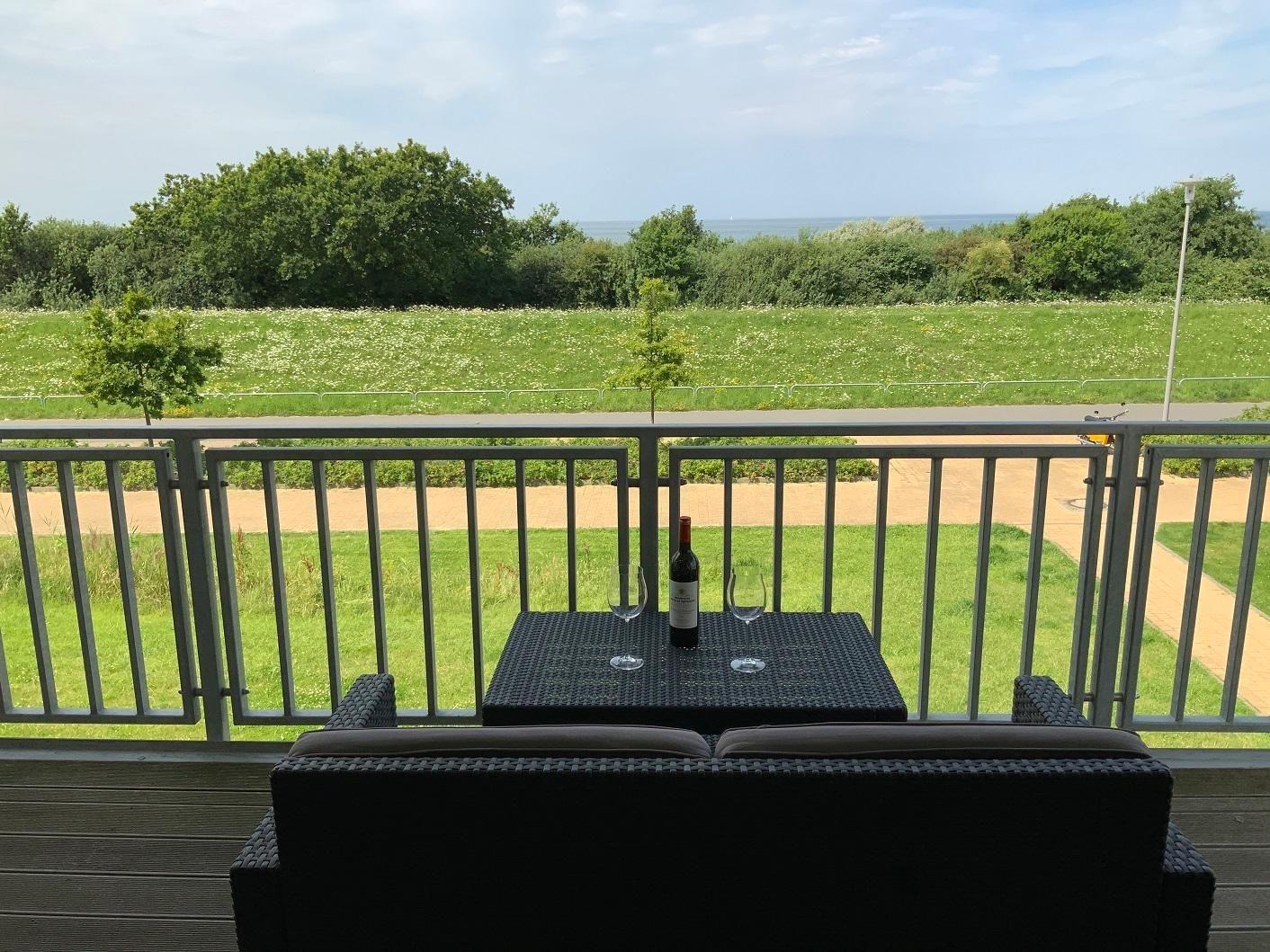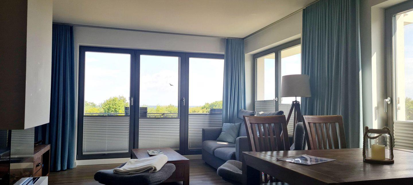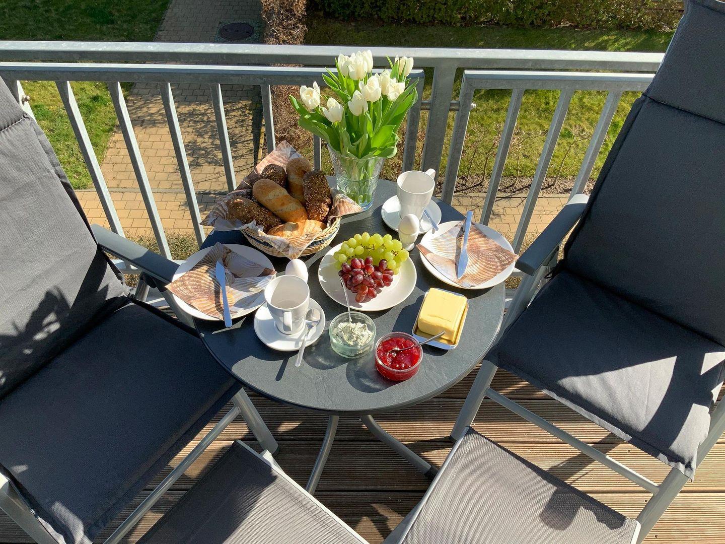 Die stilvoll modern eingerichtete 59 m² große Wohnung im ersten Obergeschoss ist für drei Personen und ein Kleinkind (bis 3 Jahre) geeignet. Mit einem traumhaften Blick auf die Ostsee lässt sie fast keine Wünsche offen. Genießen Sie einen unvergleichbaren Blick auf die Ostsee durch die großen Panoramafenster oder direkt vom Balkon. Der WOHNBEREICH empfängt Sie mit einer gemütlichen Schlafcouch (Liegefläche 140 x 200 cm) und einem modernen Gas- Kamin. Hier erleben sie auch in der kalten Jahreszeit unvergesslich schöne und erholsame Urlaubstage. Ein TV-Gerät mit integriertem DVD-Player, ein CD-Radio sowie eine kleine Bücher- und Spielesammlung stehen für die Unterhaltung zu Ihrer Verfügung. In der OFFENEN EINBAUKÜCHE finden Sie einen Hochbackofen, Cerankochfeld, Kühl- Gefrierkombination, Geschirrspüler, Mikrowelle, Kaffeemaschine, Wasserkocher und Toaster. Also alles, was Sie für die Zubereitung Ihrer Mahlzeiten benötigen. Ein Esstisch für den Verzehr ist selbstverständlich auch vorhanden. Genießen Sie die Ostseesonne und starten den Tag mit einem gemütlichen Frühstück (Beispielfoto) auf den bequemen Hochlehnern vom charmanten Balkon in Nord-Ost-Ausrichtung.