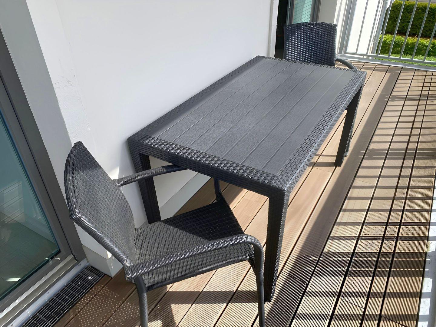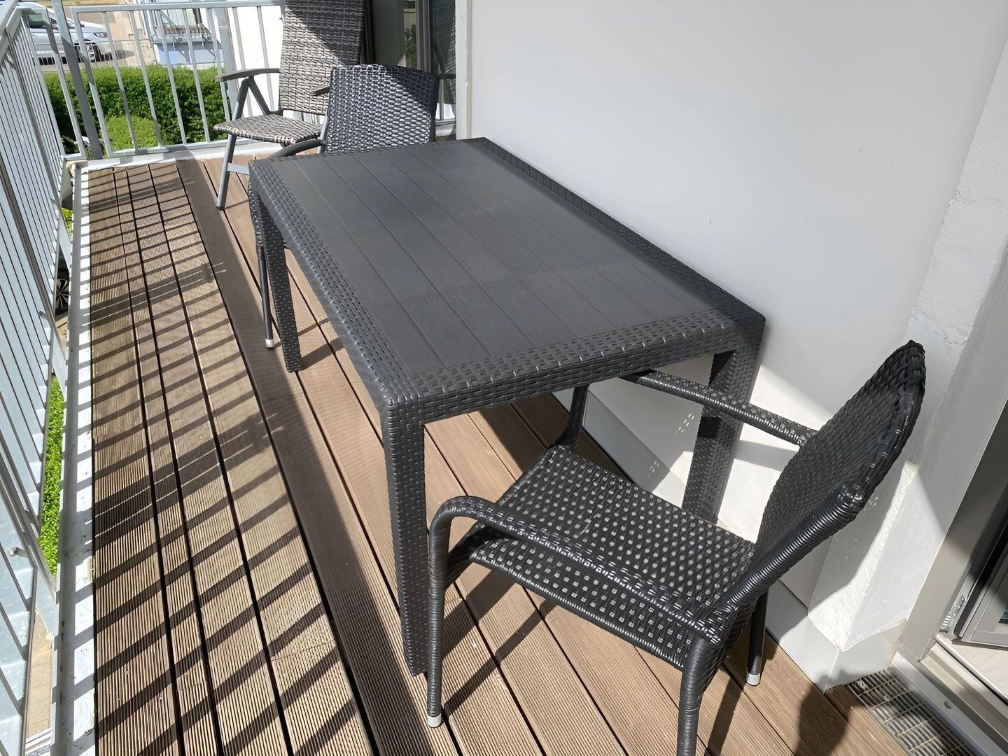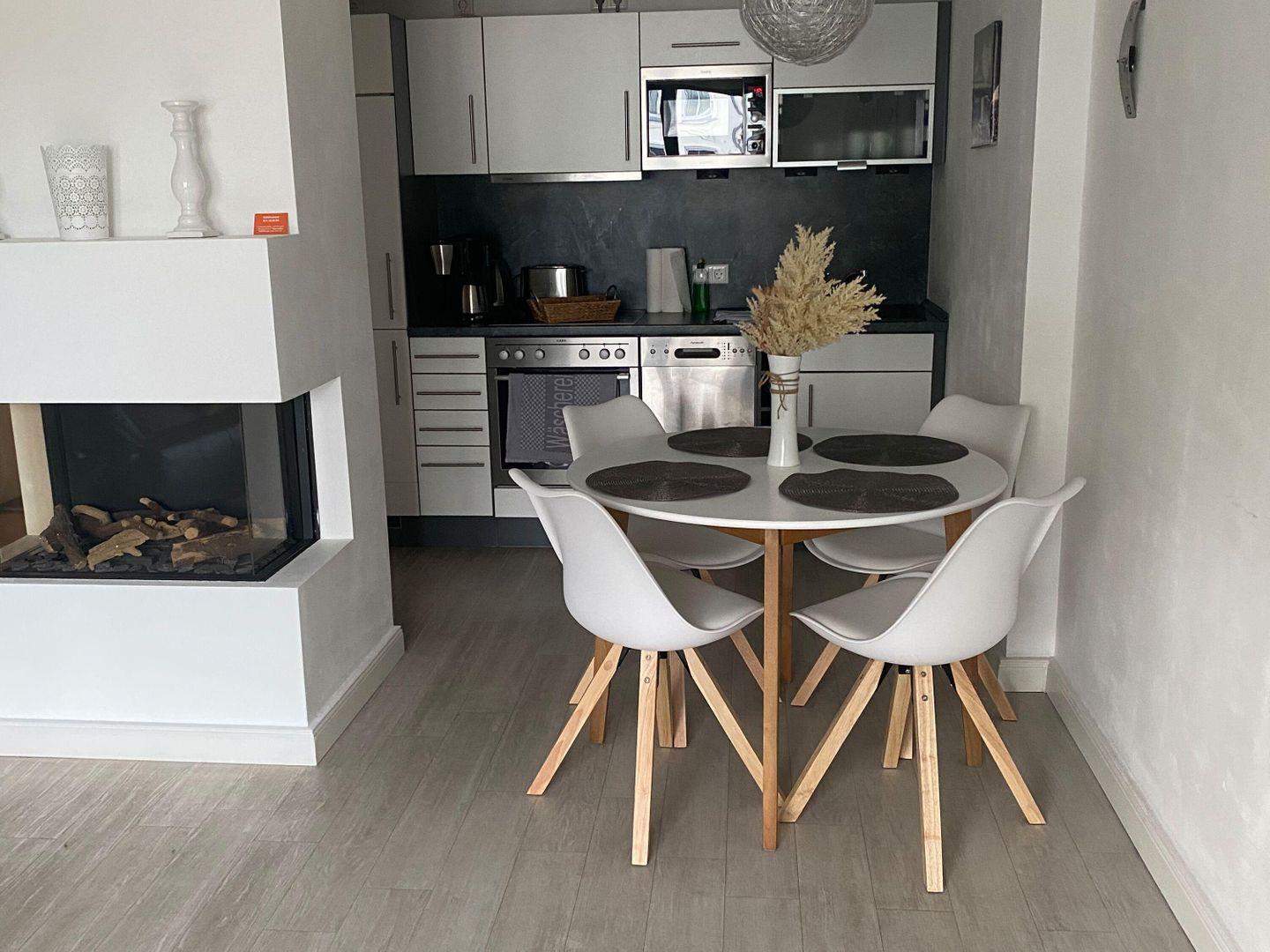 Im offenen Ess- und KÜCHENBEREICH laden ein Tisch mit vier Stühlen und eine moderne Einbauküche zu einem entspannten Urlaubsessen ein. Neben der Standardausstattung gibt es hier einen Geschirrspüler, Kühlschrank, inklusive Gefrierfach, Kaffeemaschine, Wasserkocher, Toaster und eine Mikrowelle. Für angenehme Wärme in allen Jahreszeiten sorgt die Fußbodenheizung in der Unterkunft. Zur Wohnung gehört zudem ein KOSTENFREIER AUSSENSTELLPLATZ. In der Tiefgarage befindet sich zudem eine Abstellmöglichkeit für FAHRRÄDER. Bitte beachten Sie die DURCHFAHRTSHÖHE von max. 1,90 m(!) der TIEFGARAGE. Mit einem Personenaufzug gelangen Sie direkt zu Ihrer Wohnung in der ersten Etage. Im Erdgeschoss der Wohnung befindet sich ein gekennzeichneter Abstellbereich für Kinderwagen.