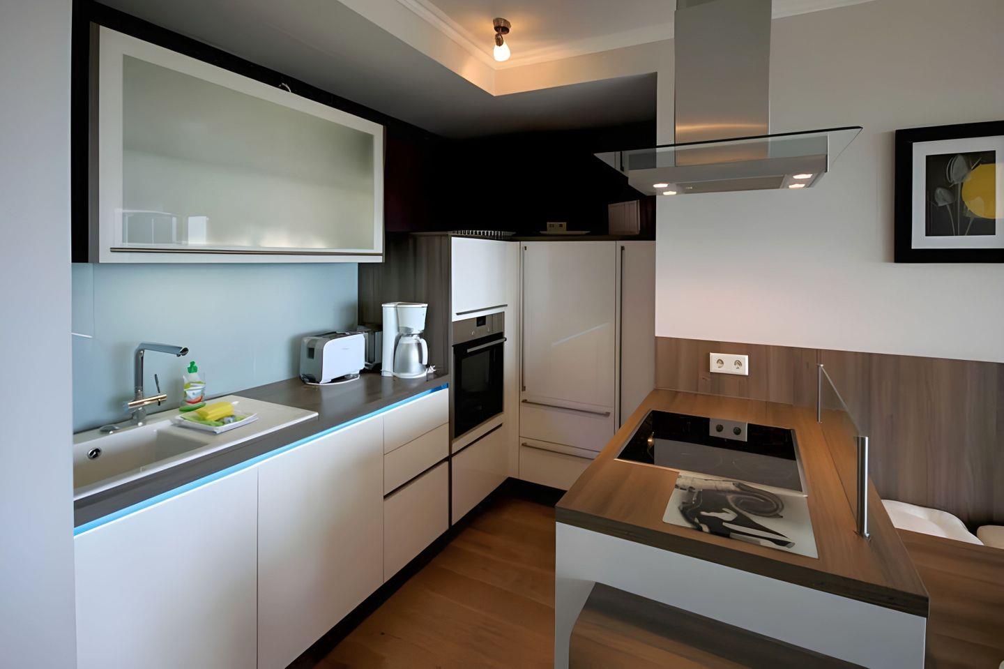 Der edle WOHNBEREICH empfängt Sie mit einer großen L-förmigen Couch, einem TV- Gerät, einem Radio und einem stilvollen Gas- Kamin. Angrenzend an die Kücheninsel befindet sich ein moderner Esstisch mit Stühlen und Sitzbank. Die hochwertige EINBAUKÜCHE ist mit Geschirrspüler, Kühlschrank, inklusive Gefrierfach, Kaffeemaschine, Wasserkocher, Toaster, Mikrowelle und diversen Kochgeräten eingerichtet worden. Beide SCHLAFZIMMER verfügen jeweils über ein Doppelbett (getrennte Matratzen 80 x 200 cm), eine TV-Gerät und raumhohe Kleiderschränke. Ihre Reisekoffer können Sie im separaten Abstellraum unterbringen. Highlight in den Räumen der Ferienwohnung sind diverse stilistisch bestechende Portraitaufnahmen und der hochwertige Eichendielenboden.