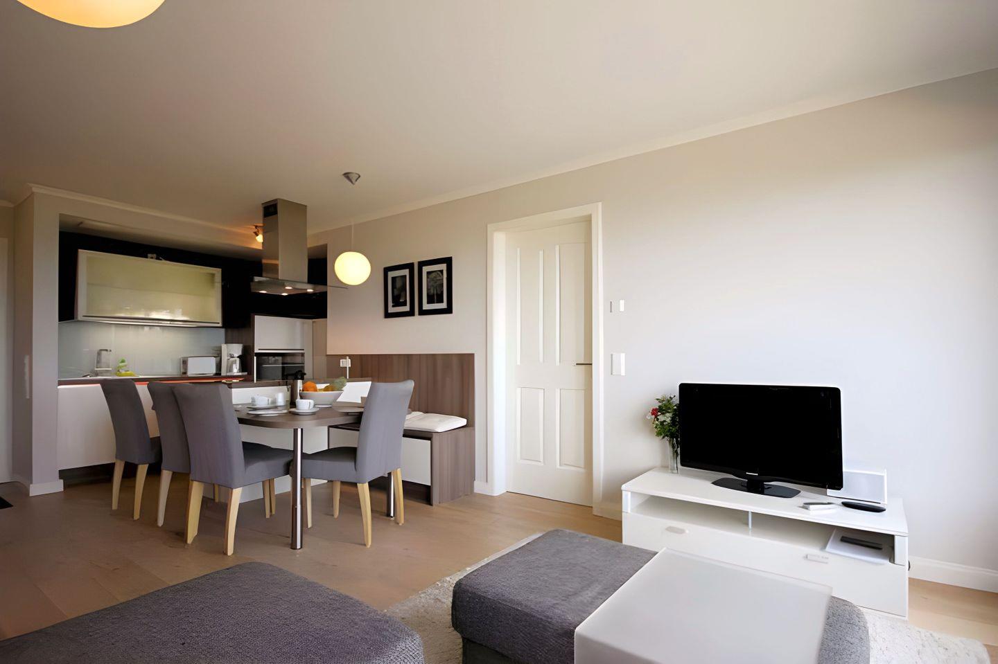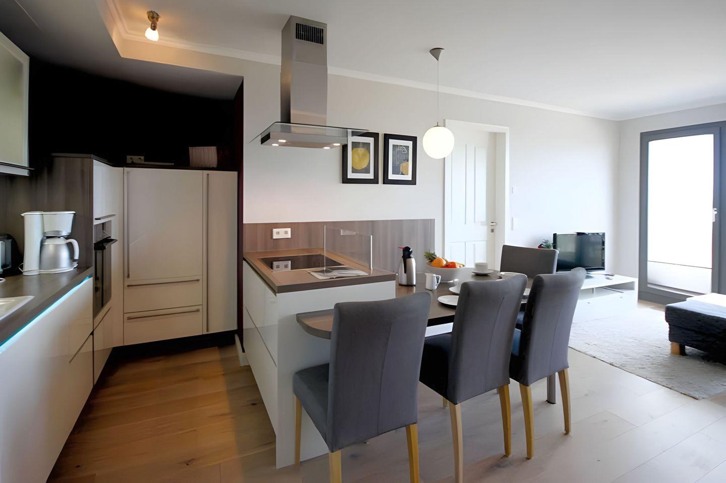 Die Villa Deichgraf WE 13 bietet auf ca. 70 m² modernen Komfort für bis zu sechs Personen. Zur Ausstattung zählen zwei Schlafzimmer, ein Balkon mit Meerblick, offener Wohn- und Küchenbereich, WLAN und Kamin. Ein kostenloser Privatparkplatz, Aufzug sowie gemeinschaftliche Waschmaschine und Trockner stehen zur Verfügung. Der Strand ist nur 100 Meter entfernt.