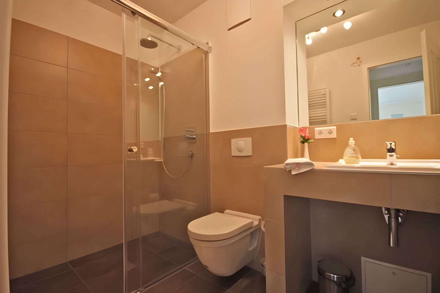 Die BEIDEN SCHLAFZIMMER empfangen Sie jeweils mit einem gemütlichen Doppelbett (7-Zonen Matratzen und verstellbarem Lattenrost) sowie Kleiderschrank und Garderobe. Ein Schlafzimmer ist zusätzlich mit einem an der Wand montierten TV- Gerät ausgestattet. Das elegante DUSCHBAD besticht mit bodengleicher Dusche, Regenbrause (Raindance Air), großem Spiegel, Handtuchtrockner, Kosmetikspiegel und Föhn. Angrenzend befindet sich ein weiteres separates GÄSTE-WC. Über den Wohnbereich gelangen Sie auf den ECK-BALKON in Süd-West-Ausrichtung mit Meerblick. Hier werden Sie, bei unbedecktem Himmel, von morgens bis abends durch Sonne verwöhnt. Das Gebäude liegt nur ca. 50 m vom Ostseestrand entfernt. Ein an die Küche angrenzender ABSTELLRAUM birgt weiteren Stauraum für Ihr Reisegepäck. Die dort gelagerten Haushaltsgeräte wie Staubsauger, Bodenwischer, Handfeger, Wäscheständer, Fußbank und Kindertoilettensitz, stehen bei Bedarf zur Verfügung. Eine Fußbodenheizung sorgt in allen Räumen für wohlige Wärme.