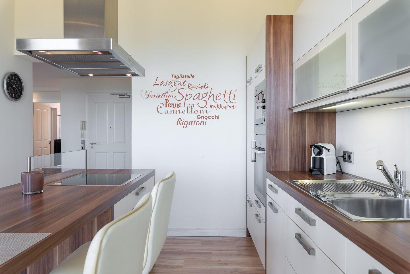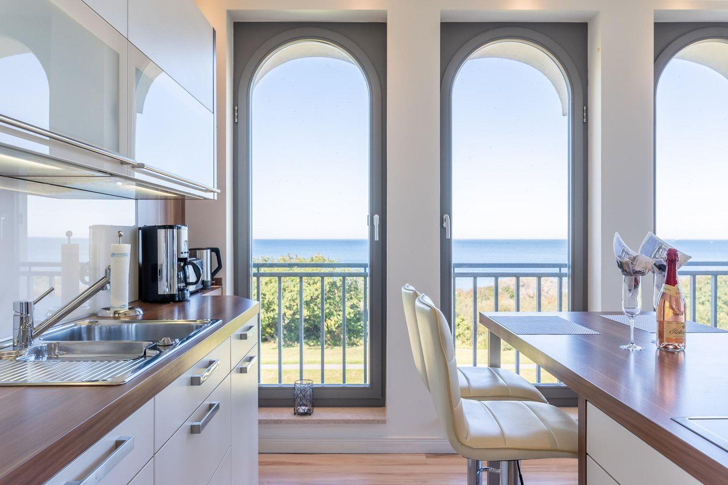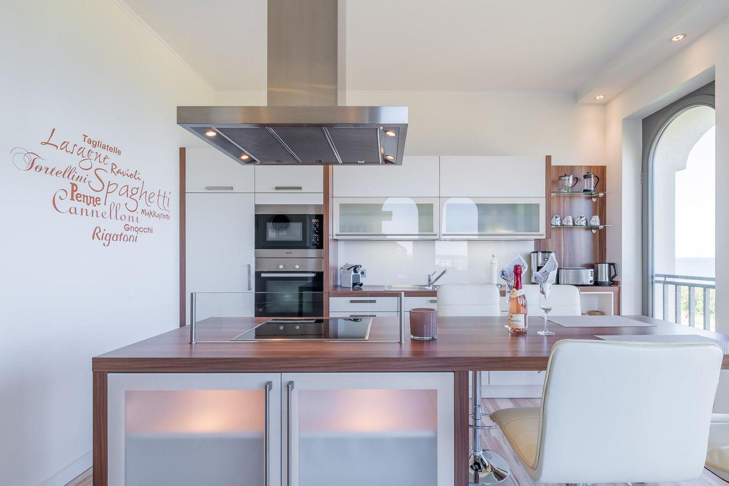 Über eine kleine Diele gelangen Sie in den luxuriösen WOHNBEREICH der Ferienwohnung. Diese verspricht entspannte Stunden. Sie ist ausgestattet mit einem TV- Gerät, einem Radio und einer großzügigen Sitzlandschaft. Angrenzend befindet sich die OFFENE EINBAUKÜCHE mit integriertem Essbereich und stilvollen Hochstühlen. Auch hier befindet sich ein TV-Gerät für rundum beste Unterhaltung. Die Küchenzeile ist voll ausgestattet mit Geschirrspüler, Kühlschrank, inklusive Gefrierfach, Kaffeemaschine, „Nespresso Maschine“, Wasserkocher, Toaster sowie Einbau-Mikrowelle.