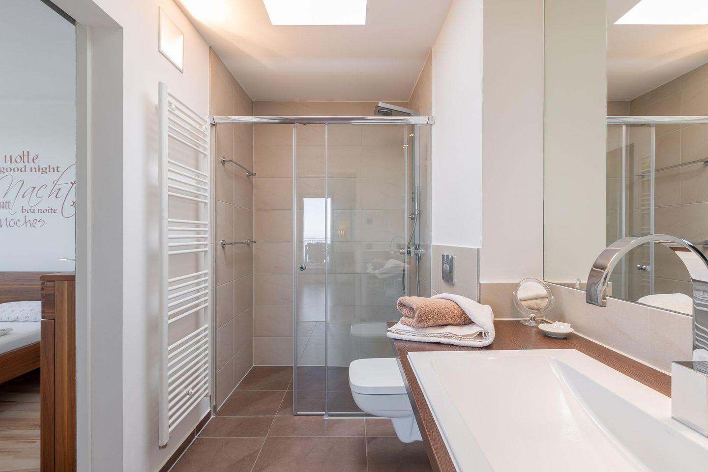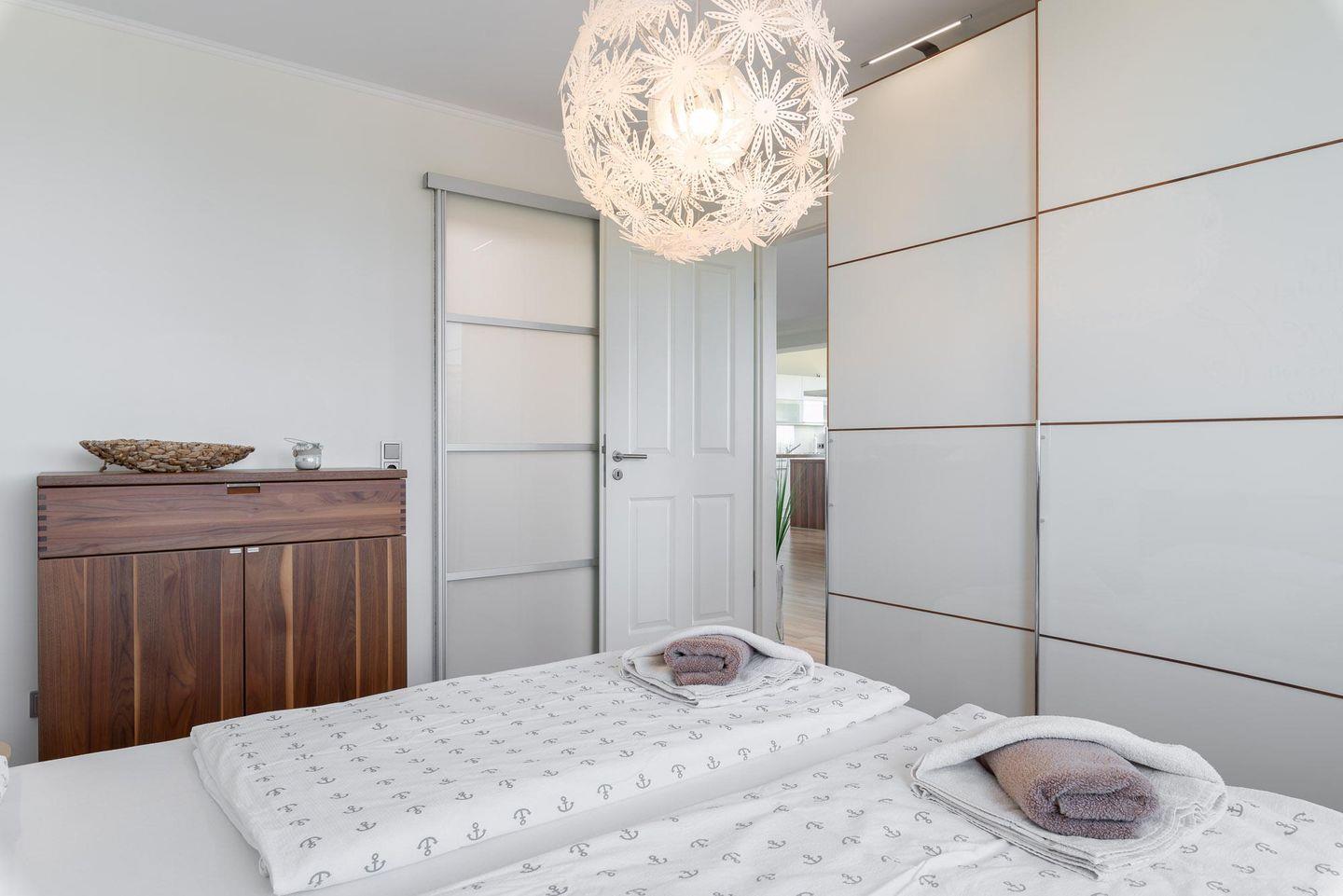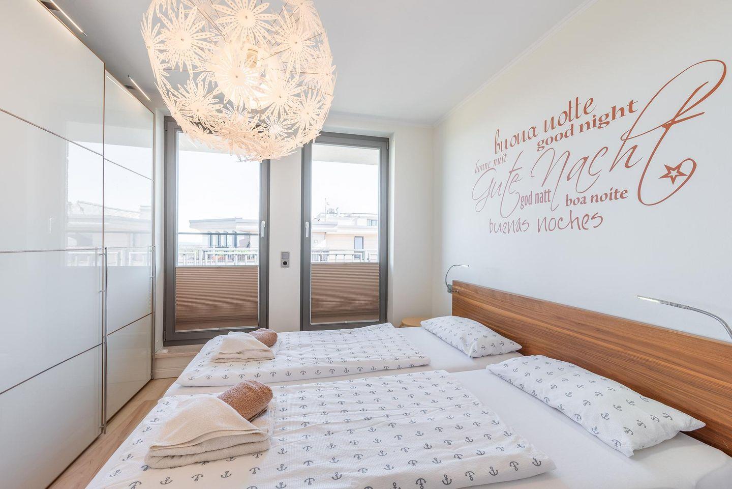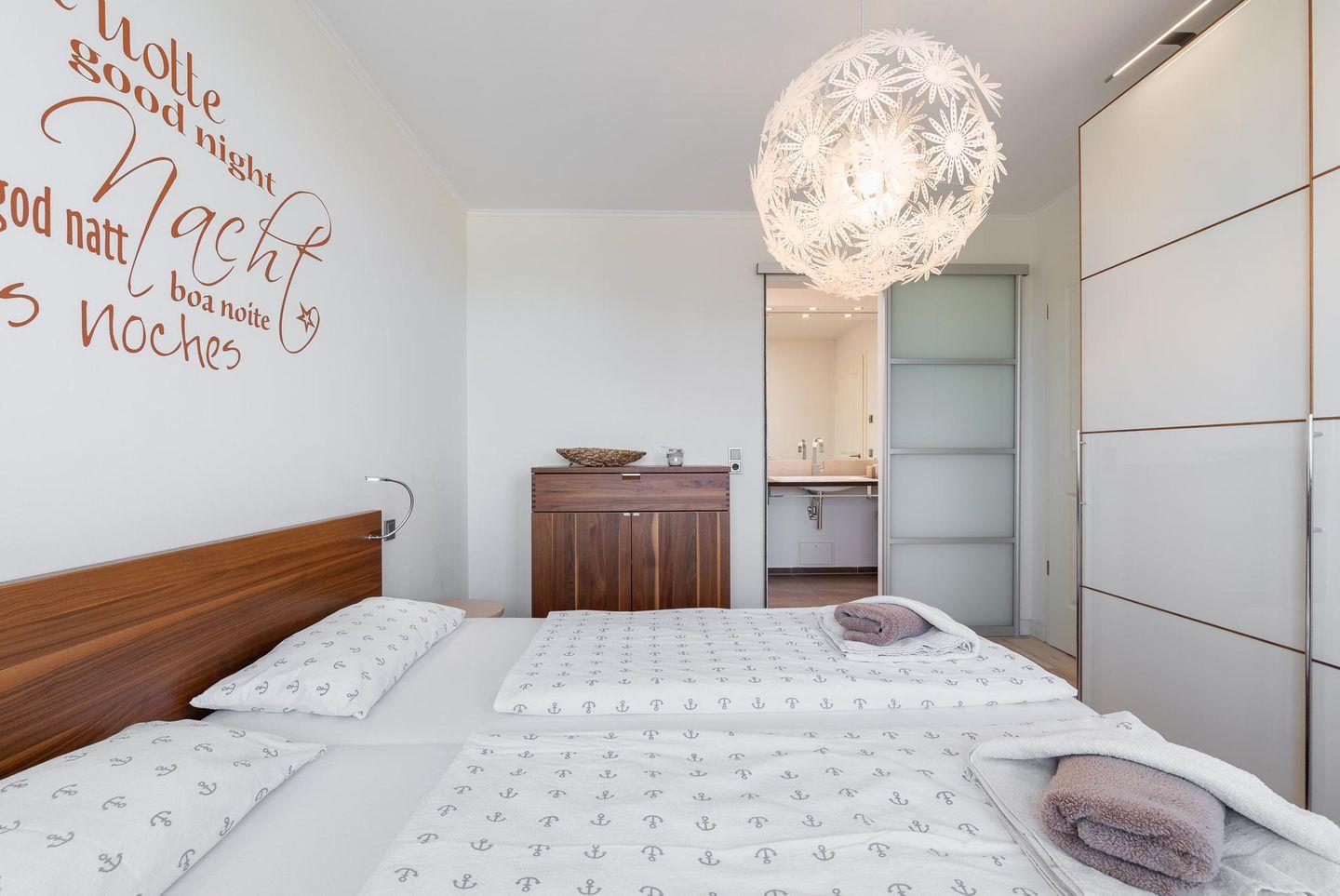 Das separate SCHLAFZIMMER empfängt Sie mit einem herrlichen Doppelbett (getrennte Matratzen) und einer raumhohen Schrankwand, die viel Stauraum für Ihr Gepäck bereithält. Das mit Tageslicht geflutete BADEZIMMER besticht mit einem Dachfenster sowie einer ebenerdigen Dusche. Über den Wohnbereich gelangen Sie auf die herrliche möblierte DACHTERRASSE (Balkon) in Nord-Ost-Ausrichtung mit eigenem STRANDKORB. Diese lädt zum gemeinsamen Aufenthalt an der frischen Seeluft mit fantastischem Meerblick ein. Highlight der hellen Wohnung sind die geschwungenen bodentiefen Fenster im Wohn- und Essbereich. In alle Räume der Unterkunft wurde eine Fußbodenheizung eingebaut.