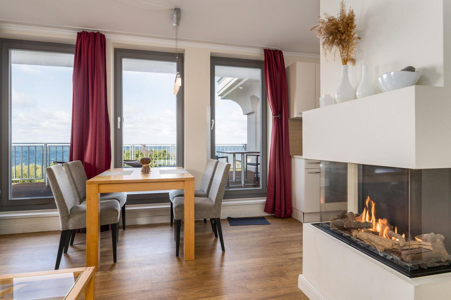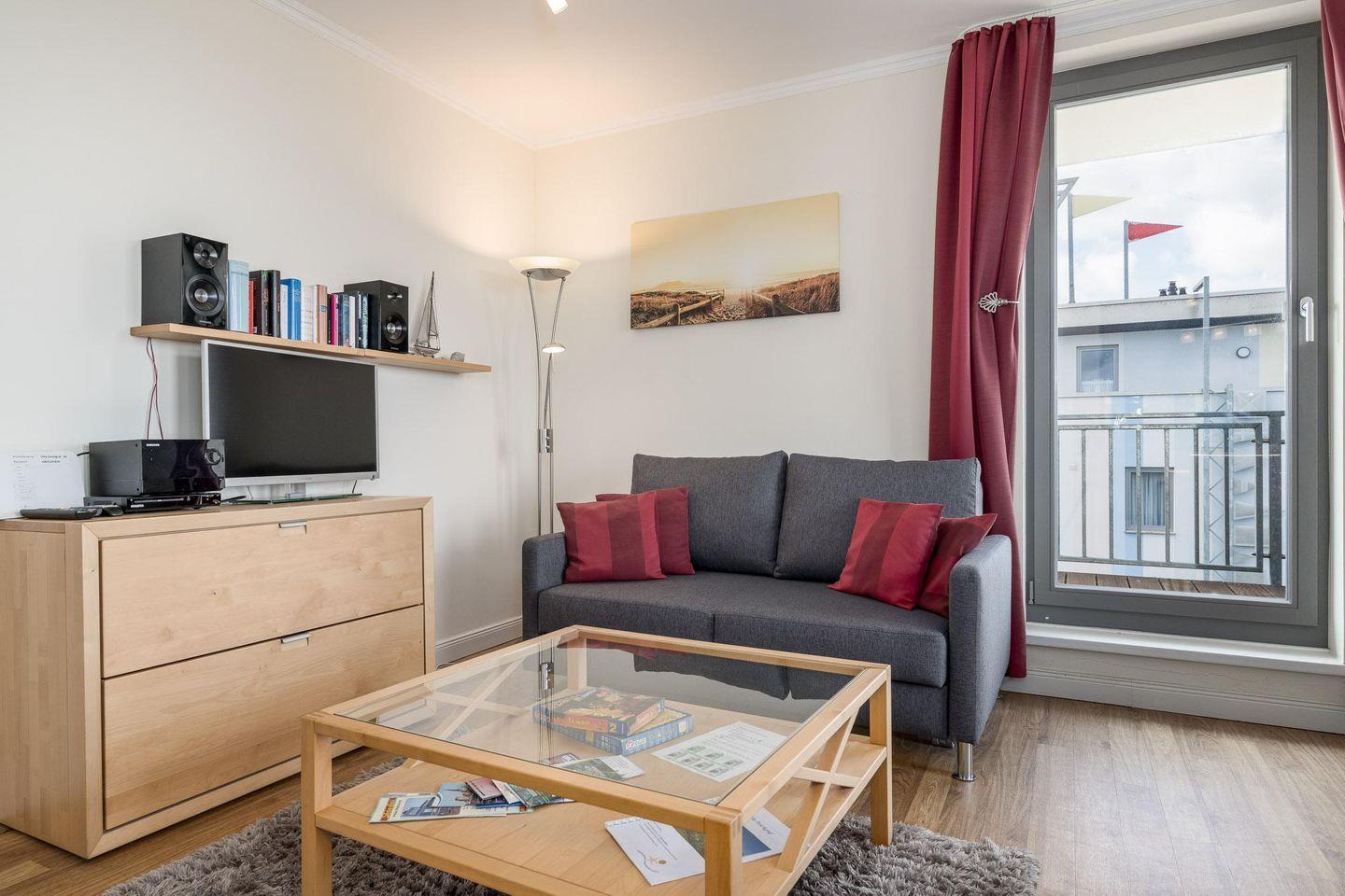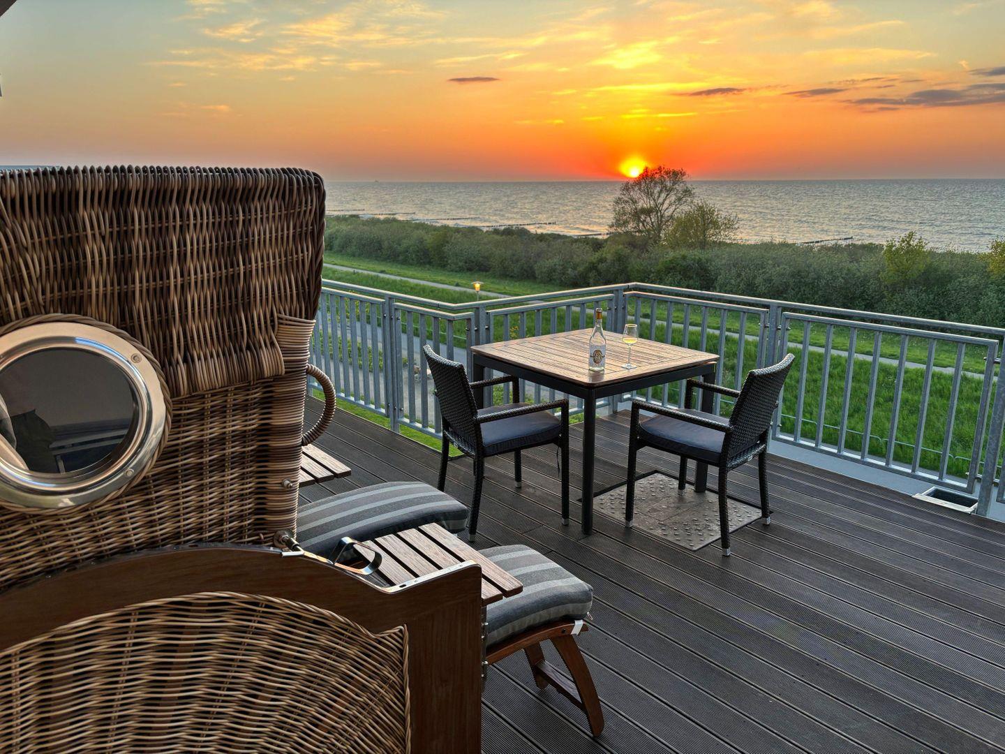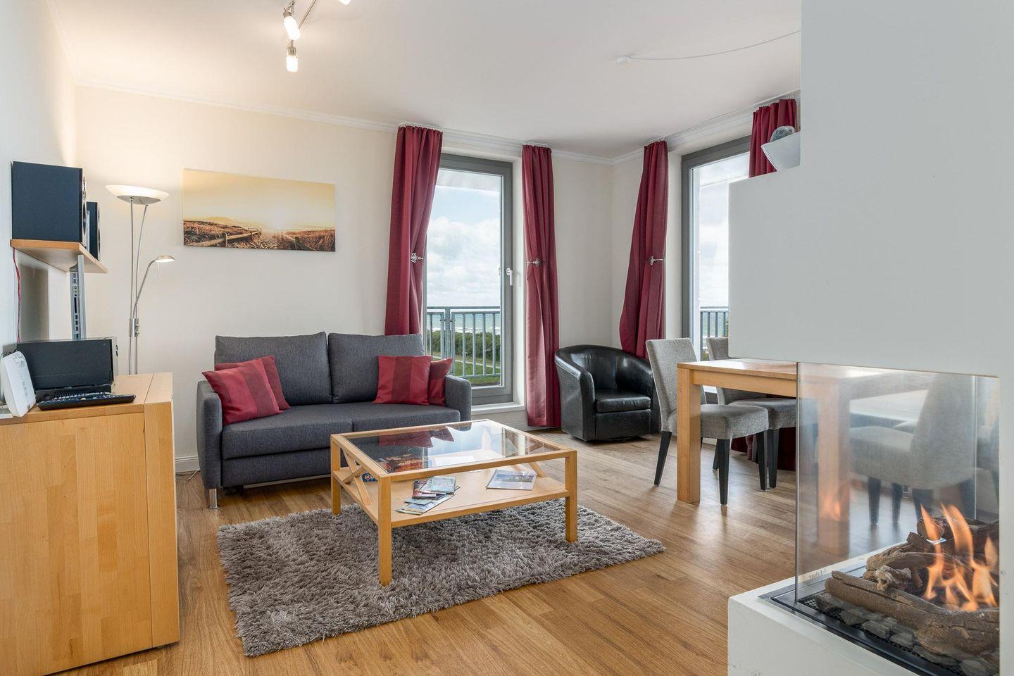 Das Herzstück der Ferienwohnung ist die große DACHTERRASSE (Balkon) in Nord-West-Ausrichtung, auf welcher Sie die Sonne vom späten Vormittag bis zum Sonnenuntergang verwöhnt. Ein Sitzplatz für vier Personen, ein großer Strandkorb und zwei Sonnenliegen laden zum Verweilen ein. Von hier aus lässt sich das bunte Treiben auf der Promenade ebenso gut beobachten wie die Möwen, die ruhig am Himmelszelt ihre Bahnen ziehen. Das WOHNZIMMER ist mit einem ausklappbaren Schlafsofa (Liegefläche 130 x 195 cm), einem TV- Gerät mit DVD-Player und einer Stereo-Anlage für die Unterhaltung ausgerüstet. Ein Esstisch mit vier Stühlen sorgt für genug Platz für Mahlzeiten oder Spielvergnügungen. Hingucker ist der moderne gläserne Gas- Kamin, dessen Flammenspiel zum Entschleunigen beiträgt.