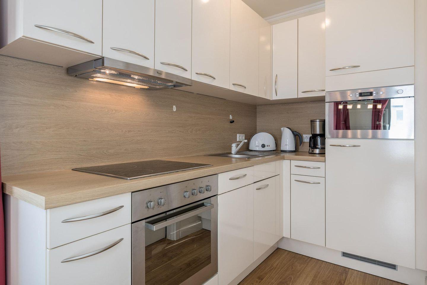 Die OFFENE EINBAUKÜCHE ist sehr gut ausgestattet mit Geschirrspüler, „Tchibo“ Espresso Maschine, Kühlschrank, inklusive Gefrierfach, Kaffeemaschine, Wasserkocher, Toaster und Mikrowelle. Im SCHLAFZIMMER empfängt Sie dann ein gemütliches Doppelbett (einzelne Matratzen 90 x 200 cm) und ein raumhoher Kleiderschrank. Das DUSCHBAD besticht mit einer ebenerdigen Dusche. Ein Haartrockner ist ebenfalls vorhanden. Bügelbrett und Bügeleisen finden Sie bei Bedarf in einem kleinen separaten ABSTELLRAUM. Die eingebaute Fußbodenheizung sorgt in allen Räumen für gleichmäßige Wärme.