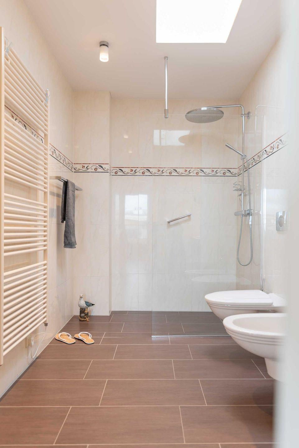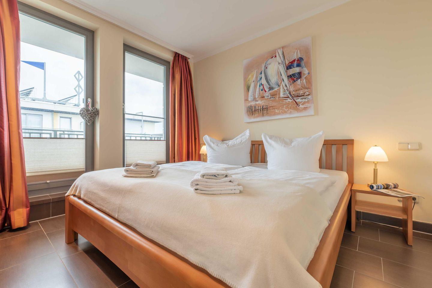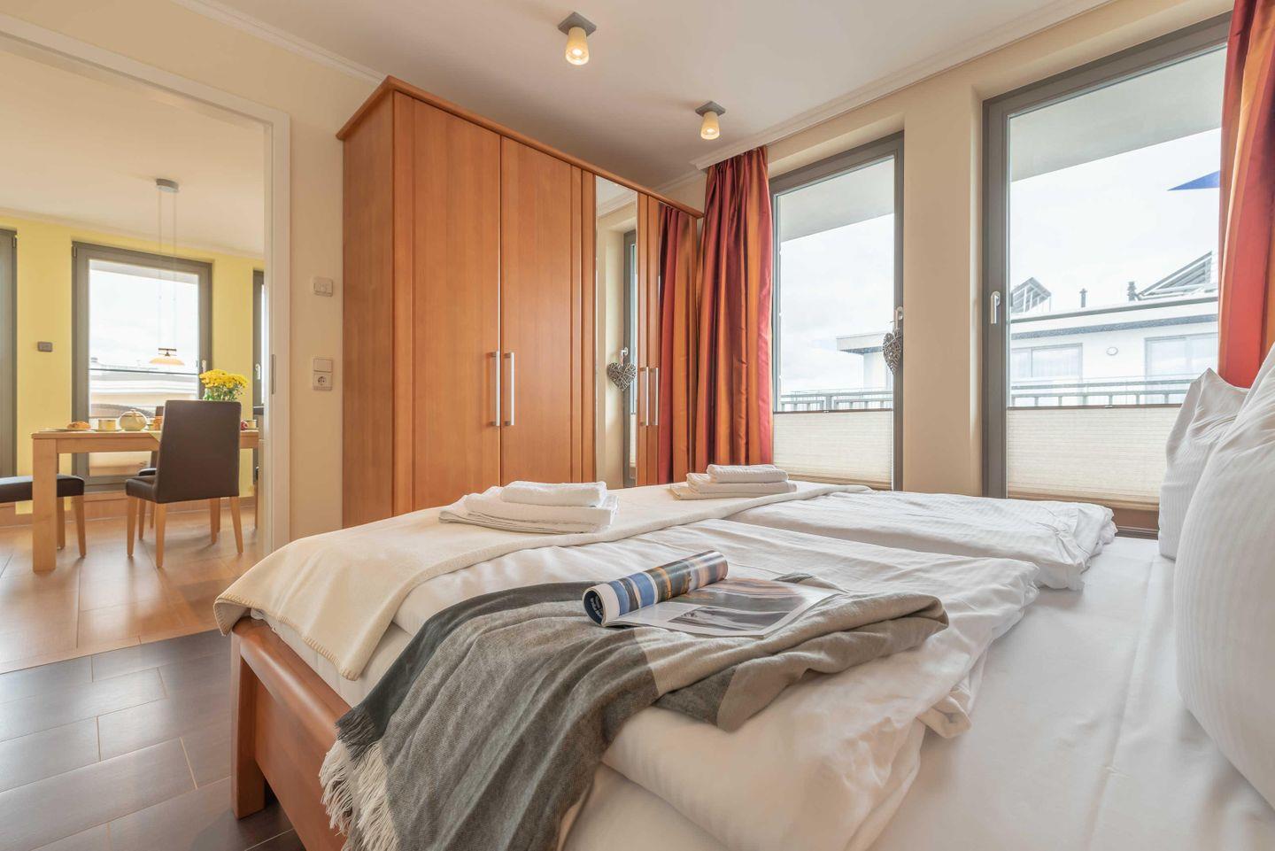Im SCHLAFZIMMER sorgt ein Doppelbett mit hochwertigen Kaltschaummatratzen und verstellbaren Lattenrosten für schöne Urlaubsträume. Ein geräumiger Kleiderschrank birgt ausreichend Stauraum für Ihr mitgebrachtes Gepäck. Das elegante DUSCHBAD verwöhnt Sie mit einer bodengleichen Dusche, inklusive Regenbrause. In einem separaten ABSTELLRAUM befinden sich Staubsauger, Bodenwischer, Eimer, Handfeger, Besen, Kehrblech und Wäscheständer sowie ein Einbauschrank mit HOTELSAFE. In allen Räumen wurde eine Fußbodenheizung installiert. Highlight der Wohnung ist die großzügige DACHTERRASSE (Balkon) mit Süd-West-Ausrichtung. Ausgestattet mit Terrassenmöbeln und einem großen STRANDKORB lassen sich hier erholsame Sonnenstunden und unvergessliche Sonnenuntergänge genießen. Die Unterkunft liegt nur 50 m vom Ostseestrand entfernt.