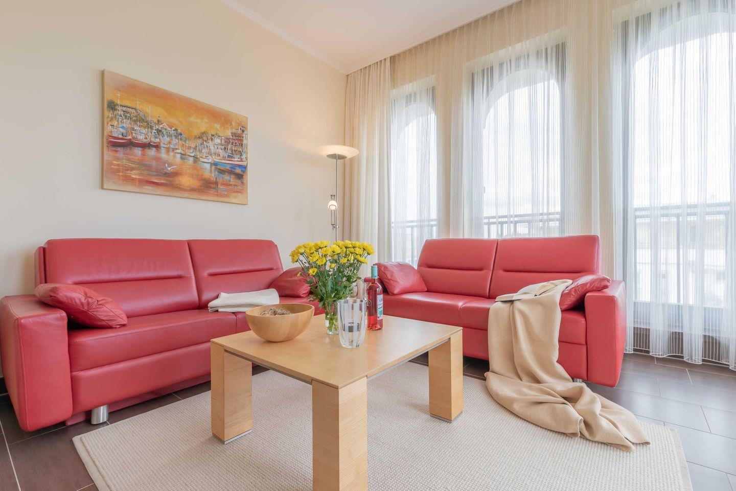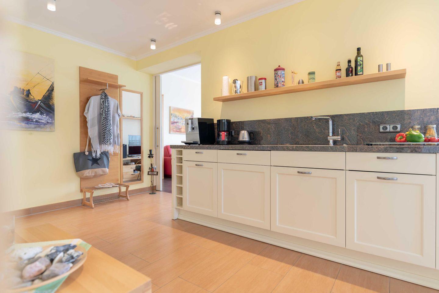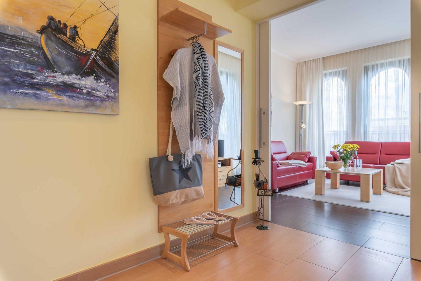 Im SCHLAFZIMMER sorgt ein Doppelbett mit hochwertigen Kaltschaummatratzen und verstellbaren Lattenrosten für schöne Urlaubsträume. Ein geräumiger Kleiderschrank birgt ausreichend Stauraum für Ihr mitgebrachtes Gepäck. Das elegante DUSCHBAD verwöhnt Sie mit einer bodengleichen Dusche, inklusive Regenbrause. In einem separaten ABSTELLRAUM befinden sich Staubsauger, Bodenwischer, Eimer, Handfeger, Besen, Kehrblech und Wäscheständer sowie ein Einbauschrank mit HOTELSAFE. In allen Räumen wurde eine Fußbodenheizung installiert. Highlight der Wohnung ist die großzügige DACHTERRASSE (Balkon) mit Süd-West-Ausrichtung. Ausgestattet mit Terrassenmöbeln und einem großen STRANDKORB lassen sich hier erholsame Sonnenstunden und unvergessliche Sonnenuntergänge genießen. Die Unterkunft liegt nur 50 m vom Ostseestrand entfernt.