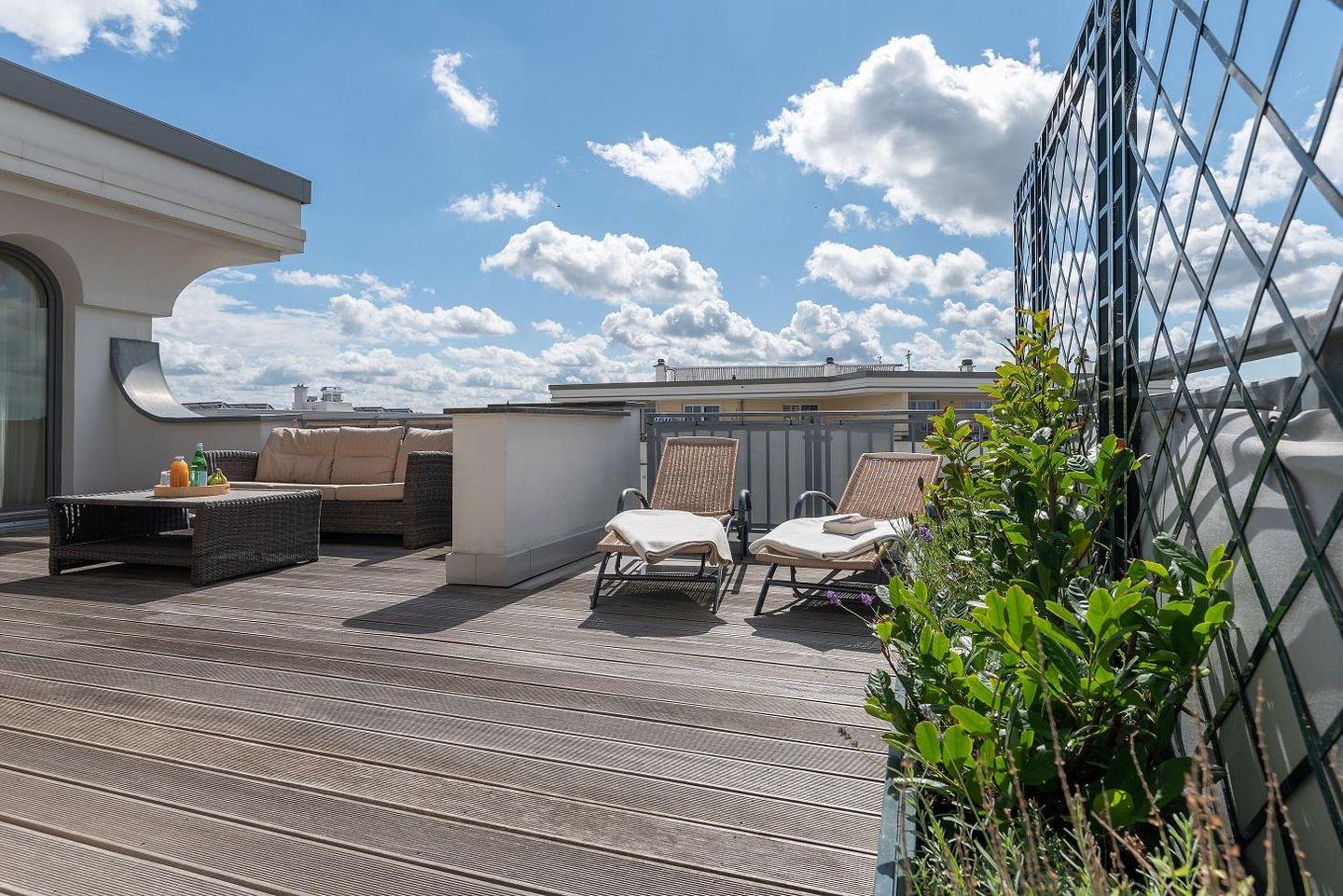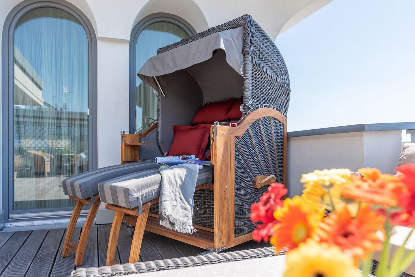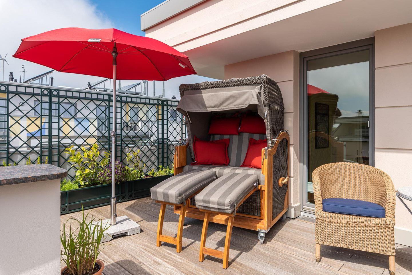Das Penthouse in der Villa Deichgraf bietet auf ca. 85 m² modernen Komfort und eine offene Küche, ein Schlafzimmer, ein Bad sowie eine großzügige Terrasse mit eingeschränktem Meerblick. Zur Ausstattung gehören WLAN, Kabel-TV, Safe und ein kostenloser Privatparkplatz. Ein Aufzug, gemeinschaftlich nutzbare Waschmaschine und Trockner sowie ein Strandkorb und Gartenmöbel runden das Angebot ab.