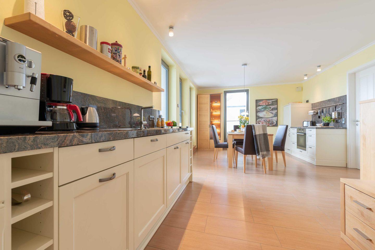 Treten Sie ein in den hellen, lichtdurchfluteten WOHNRAUM. Massivholzmöbeln aus Erlenholz geben dem Raum ein warmes angenehmes Flair. Hingucker ist die gemütliche Leder-Sitzgarnitur, welche in wenigen Handgriffen zu einer Schlafgelegenheit für eine dritte Person umgewandelt werden kann (Liegefläche 140 x 200 cm). Ein TV- Gerät und ein CD-Player sorgen für bunte Unterhaltung. Angrenzend an den Wohnbereich befindet sich der Essbereich mit voll eingerichteter OFFENER EINBAUKÜCHE (Geschirrspüler, Ceran-Kochfeld, Backofen, Kühlschrank mit Gefrierfach, Espressomaschine, Wasserkocher, Eierkocher und Toaster).