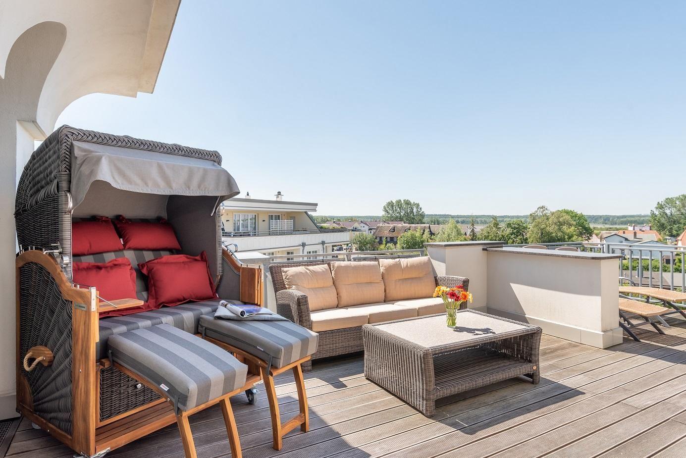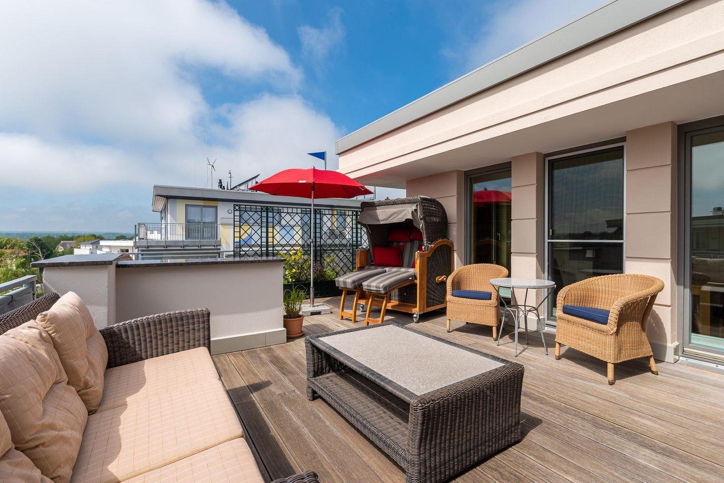 STRANDNAHE 2-RAUM-PENTHOUSE-WOHNUNG FÜR MAX. 3 ERWACHSENE UND 1 KLEINKIND, GROSSE DACHTERRASSE (BALKON) MIT STRANDKORB UND TRAUMHAFTEM OSTSEEBLICK IM 3.OG.