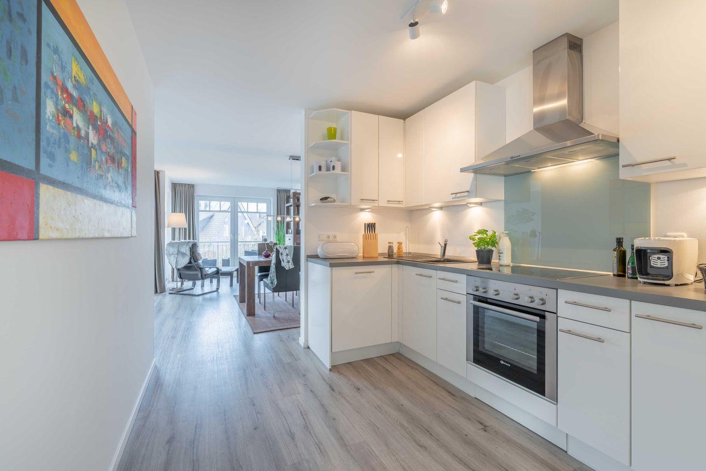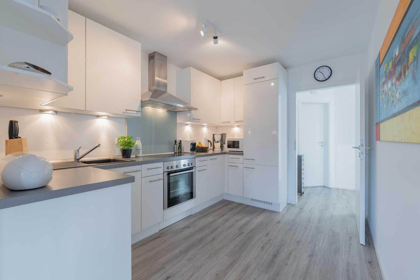 Die separate großzügige KÜCHE wurde mit einer moderner Küchentechnik ausgestattet. Geschirrspüler, Kühlschrank inkl. Gefrierfach, Backofen mit Cerankochfeld und Mikrowelle ausgestattet. Zusätzlich zur Kaffeemaschine gibt es auch eine „Tchibo Cafissimo“- Kapselmaschine. Wasserkocher und Toaster sind natürlich auch vorhanden.