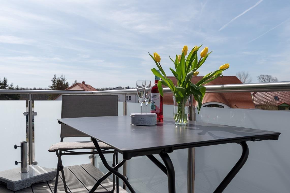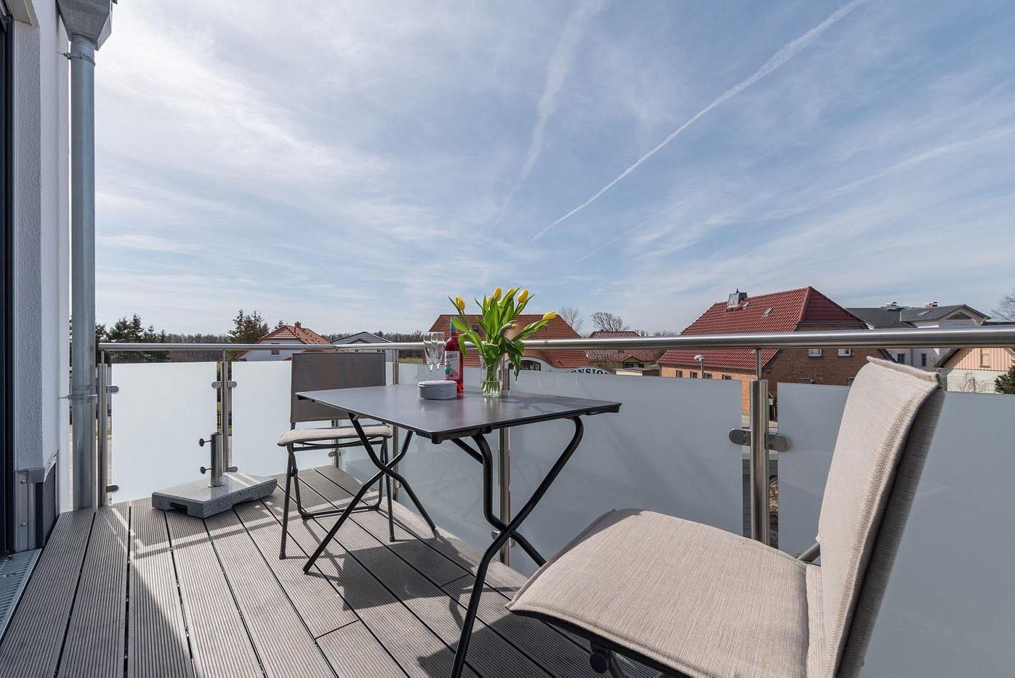 Balkon mit Süd-West-Ausrichtung und gemütlicher Sitzaustattung. Ein kostenfreier