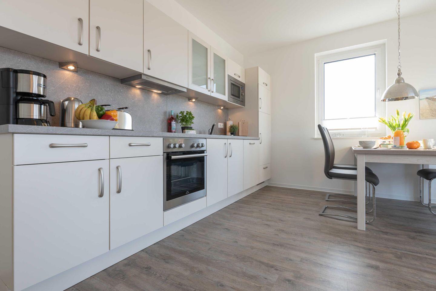 Backofen, Mikrowelle, Geschirrspüler und Dunstabzugshaube. Das helle Bad