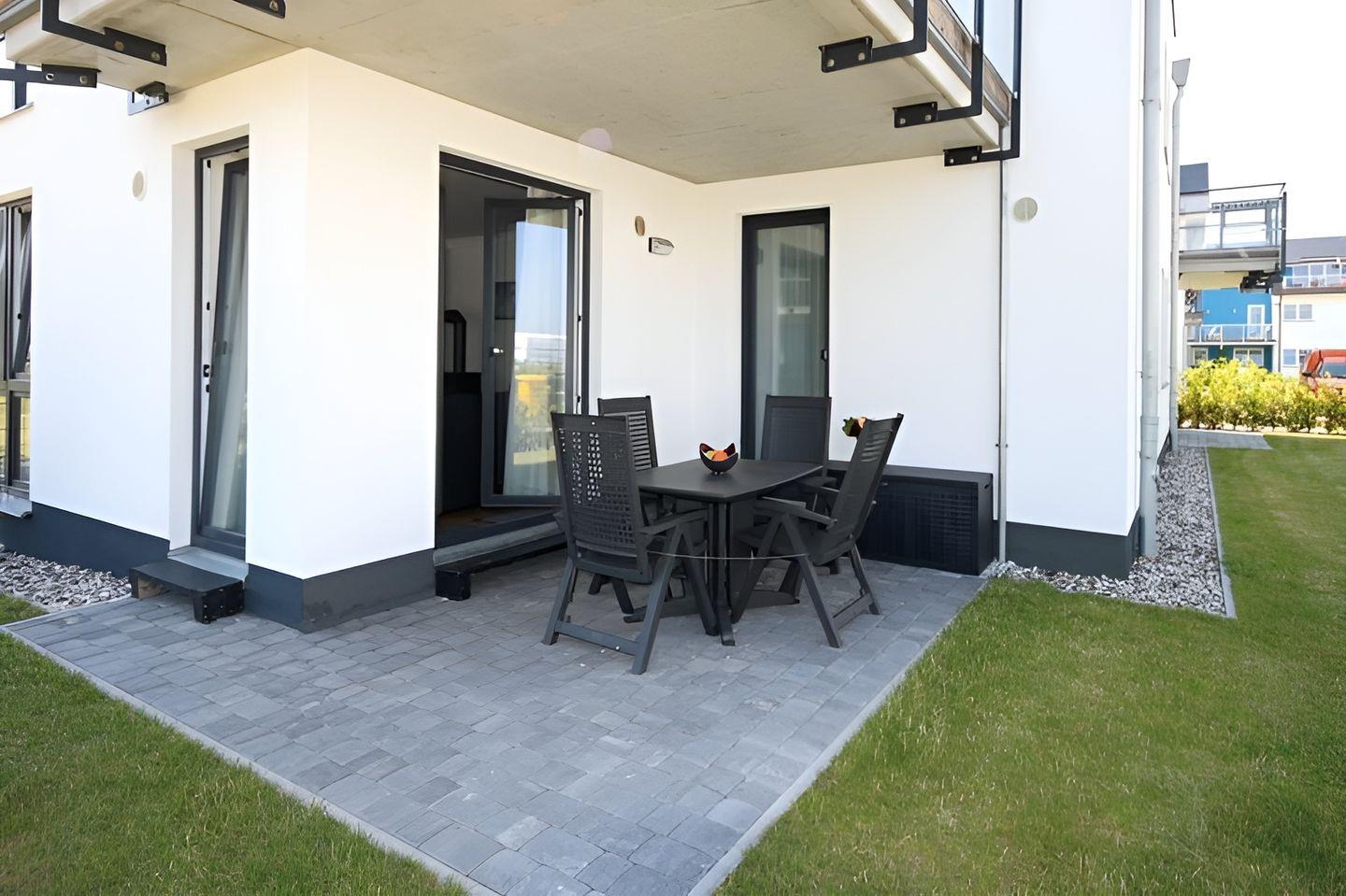 Gartenmöbeln und kleiner Rasenfläche.