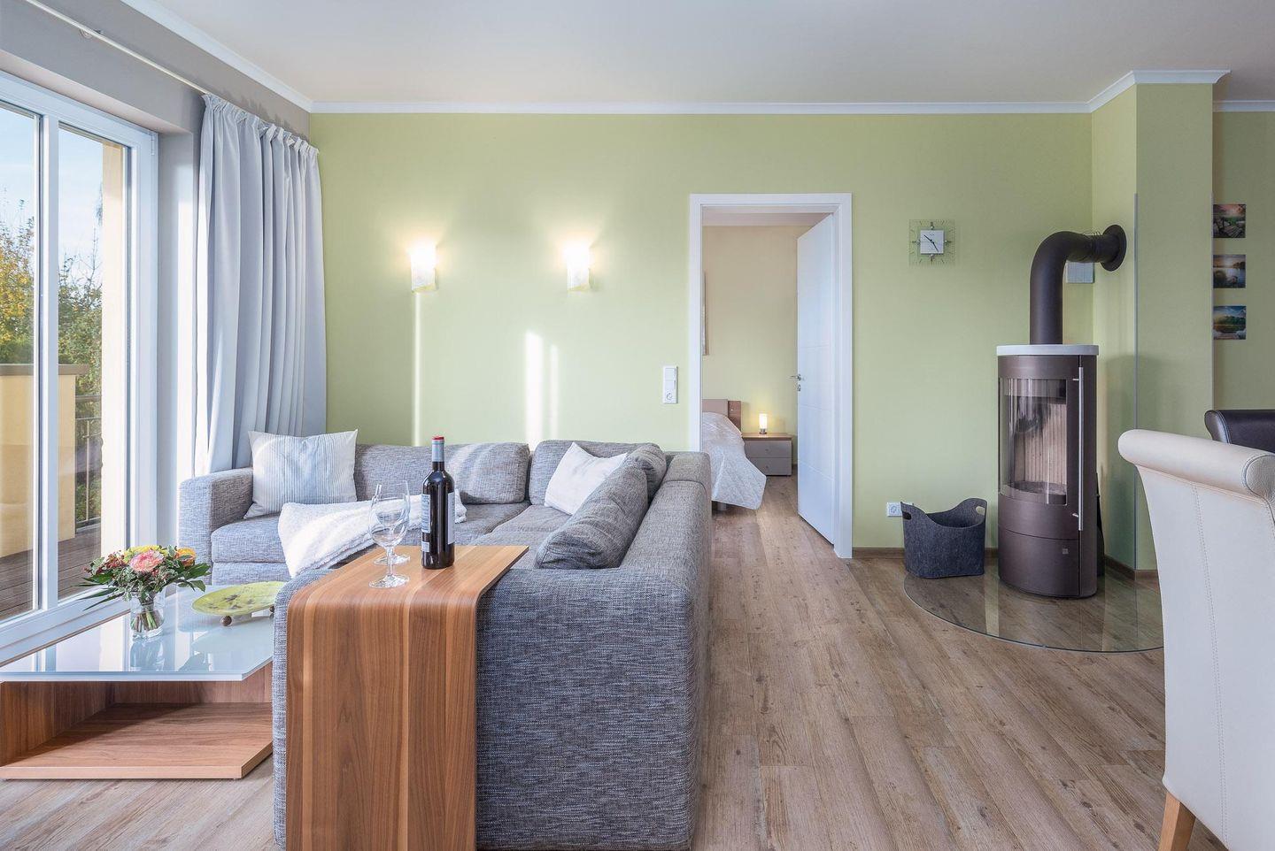 Wohlfühlatmosphäre mit einem hyggeligen Kaminofen (Olsberg-Palena-Concept), einem Flatscreen TV mit