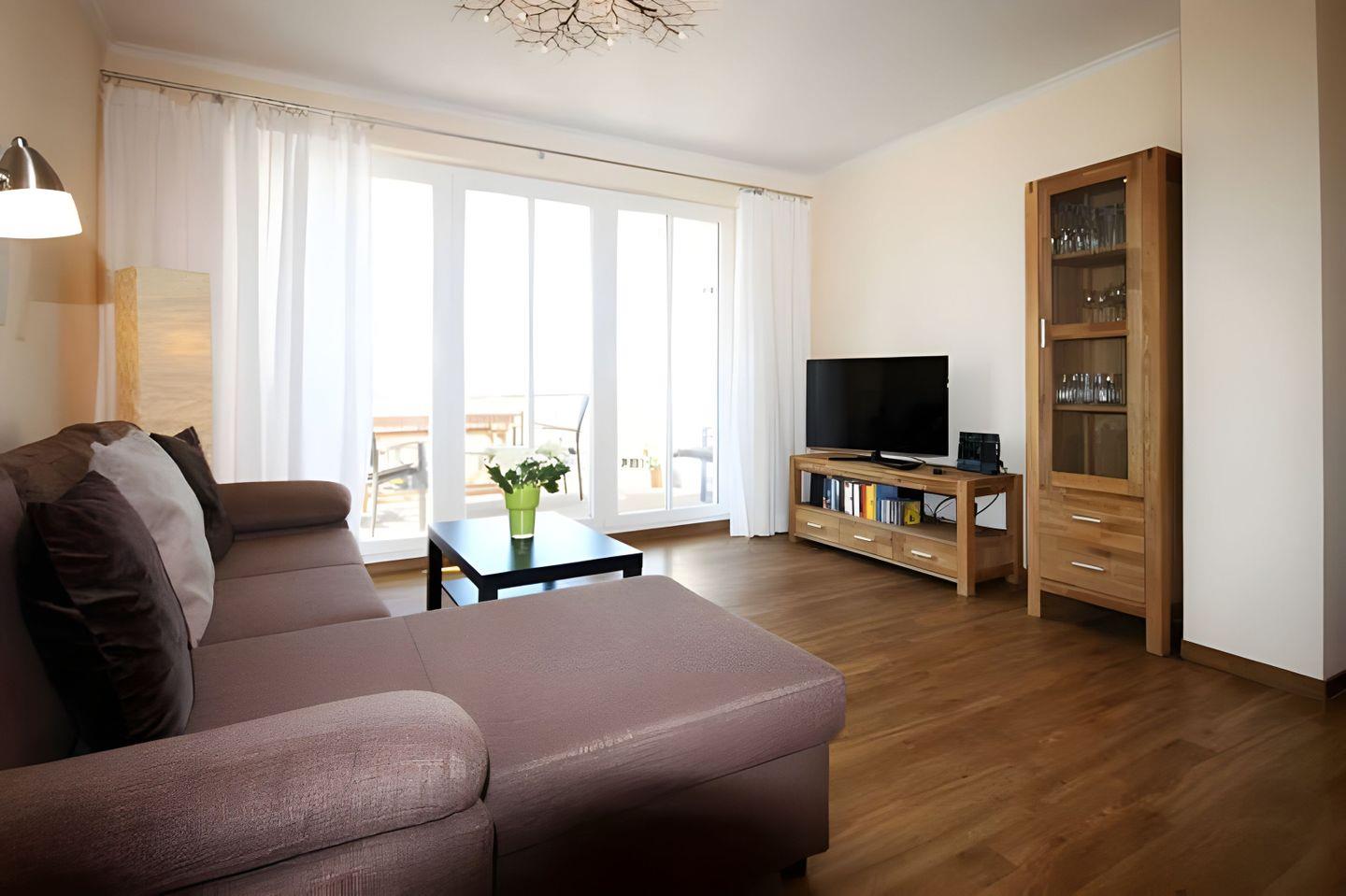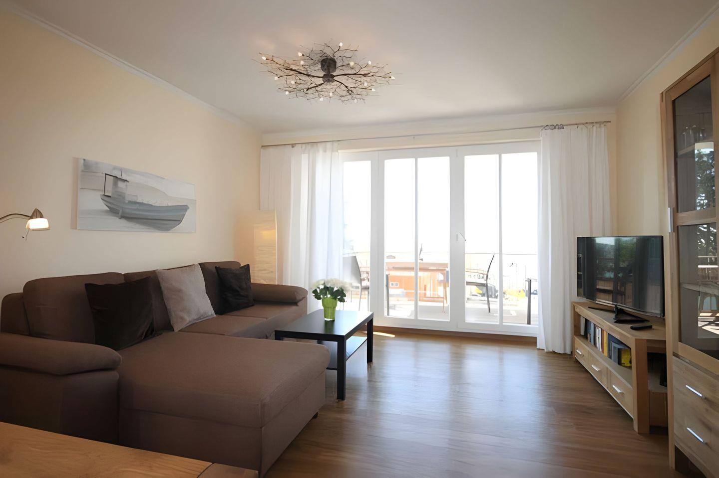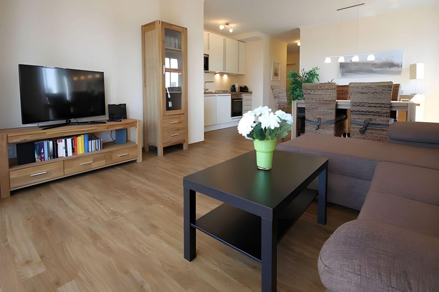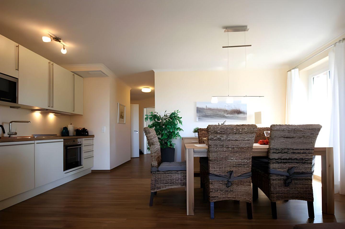 Der WOHNRAUM dieser Ferienwohnung bietet Ihnen eine große, L-förmige Couch zum Relaxen und Schlafen an. Zur Entspannung gehören auch ein großes TV-Gerät und eine kleine Hi-Fi-Anlage. Im angrenzenden offenen Koch- und Essbereich befindet sich die EINBAUKÜCHE mit Geschirrspüler, Kühlschrank, inklusive Gefrierfach, Backofen, Herd (Ceranfeld) einer Mikrowelle sowie weiterem Küchenzubehör. Der große Holztisch mit vier gemütlichen Rattan Stühlen lädt Sie zu gemeinsamen Mahlzeiten und Spieleabenden ein. Ein großes Doppelbett und zwei Einzelbetten finden Sie in den beiden SCHLAFRÄUMEN vor. Im großen Schlafzimmer steht Ihnen ein dreitüriger geräumiger Kleiderschrank zur Verfügung. Im kleineren Schlafraum zwei Einzelbetten sowie ein kleiner Schrank. Diese Ferienwohnung wartet praktischerweise mit ZWEI DUSCHBÄDERN auf. Beide verfügen über eine bodengleiche Dusche und einen großen Waschtisch mit passendem Spiegel. Eines davon ist mit einem Handtuchtrockner ausgestattet. Auf dem großzügigen, nach Nordwesten hin ausgerichteten BALKON mit einem kleinem Meerblick, lässt sich die Nachmittags- und Sonnenuntergangstimmung perfekt genießen. Natürlich stehen dafür bequeme Balkonmöbel bereit. Ein ABSTELLRAUM für Ihr großes Urlaubsgepäck finden Sie ebenfalls in dieser Unterkunft. Eine Fußbodenheizung in allen Räumen sorgt auch im Winter für Behaglichkeit. Zur Ferienwohnung gehört zudem ein KOSTENFREIER TIEFGARAGENPLATZ. Bitte beachten Sie die DURCHFAHRTSHÖHE von MAX. 1,90 m(!) Bei Überschreitung der maximalen Durchfahrtshöhe, besteht die Möglichkeit auf einen kostenpflichtigen Parkplatz in unmittelbarer Nähe auszuweichen. Der im Gebäude installierte Aufzug erleichtert den Transport der mitgebrachten Koffer. Zudem befindet sich im Objekt eine Abstellmöglichkeit für Ihre FAHRRÄDER.