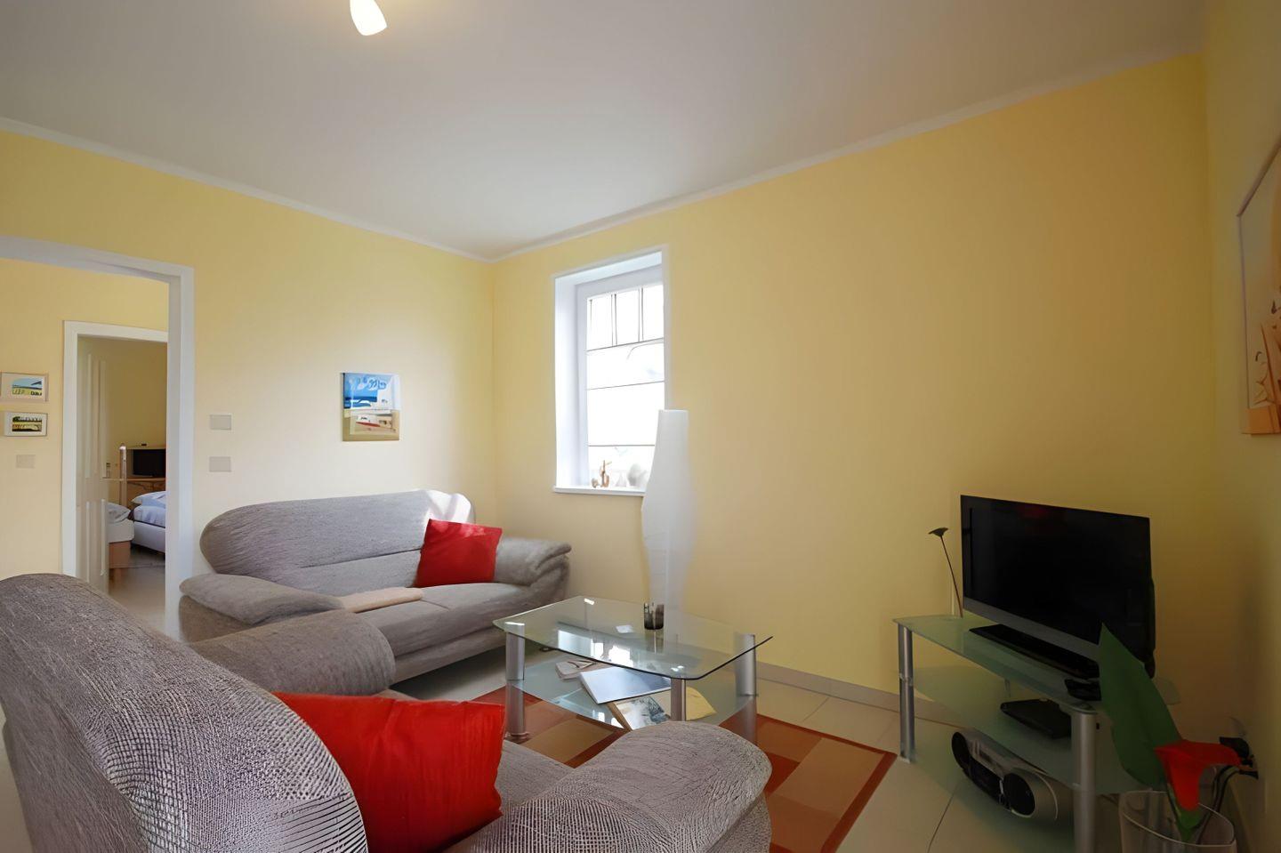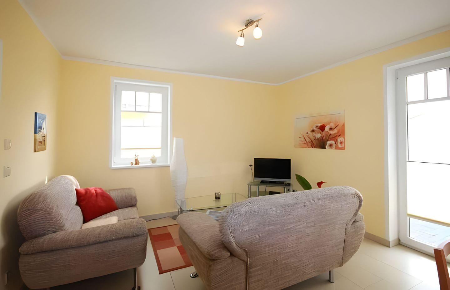 STRANDNAHE, FAMILIENFREUNDLICH AUSGESTATTETE 3-RAUM-FERIENWOHNUNG (BACKBORD) FÜR MAX. 4 PERSONEN, MIT 2 SCHLAFZIMMERN, SONNENTERRASSE (SÜD-WEST-AUSRICHTUNG) UND SAUNABLOCKHAUS IM EG.