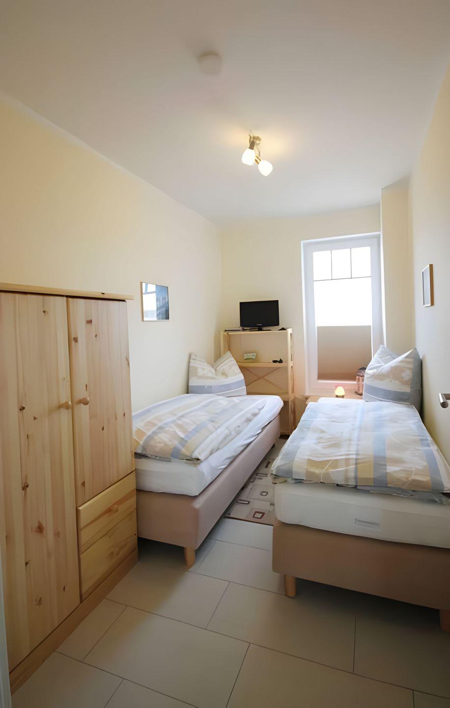 In einem der beiden SCHLAFZIMMER befinden sich zwei Einzelbetten und ein TV-Gerät. Im zweiten Schlafzimmer steht ein komfortables Doppelbett für Sie bereit. Ein DUSCHBAD mit Handtuchtrockner und Föhn, gehört selbstverständlich auch zu der Ferienwohnung.