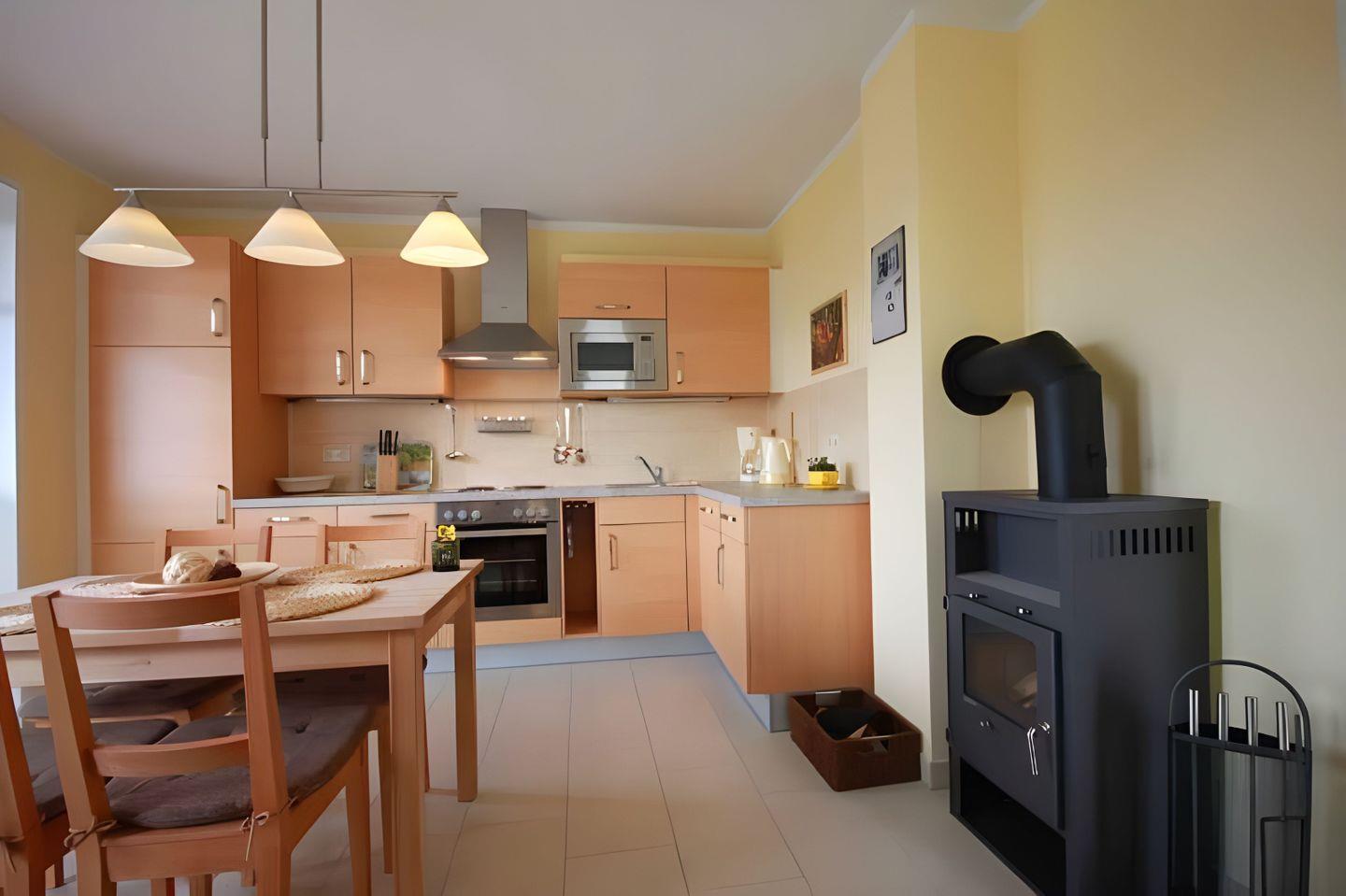 Im LICHTDURCHFLUTETEM WOHN- ESSBEREICH gibt es eine voll ausgestattete EINBAUKÜCHE: Ein Herd mit 4-Cerankochfeldern und Backofen, Filterkaffeemaschine, Mikrowelle, Wasserkocher, Toaster und einen Kühlschrank mit integriertem Gefrierfach.
