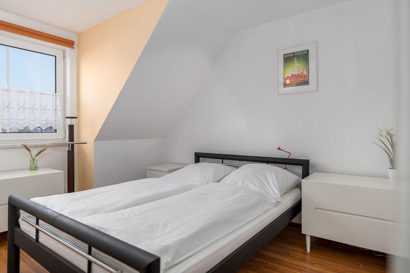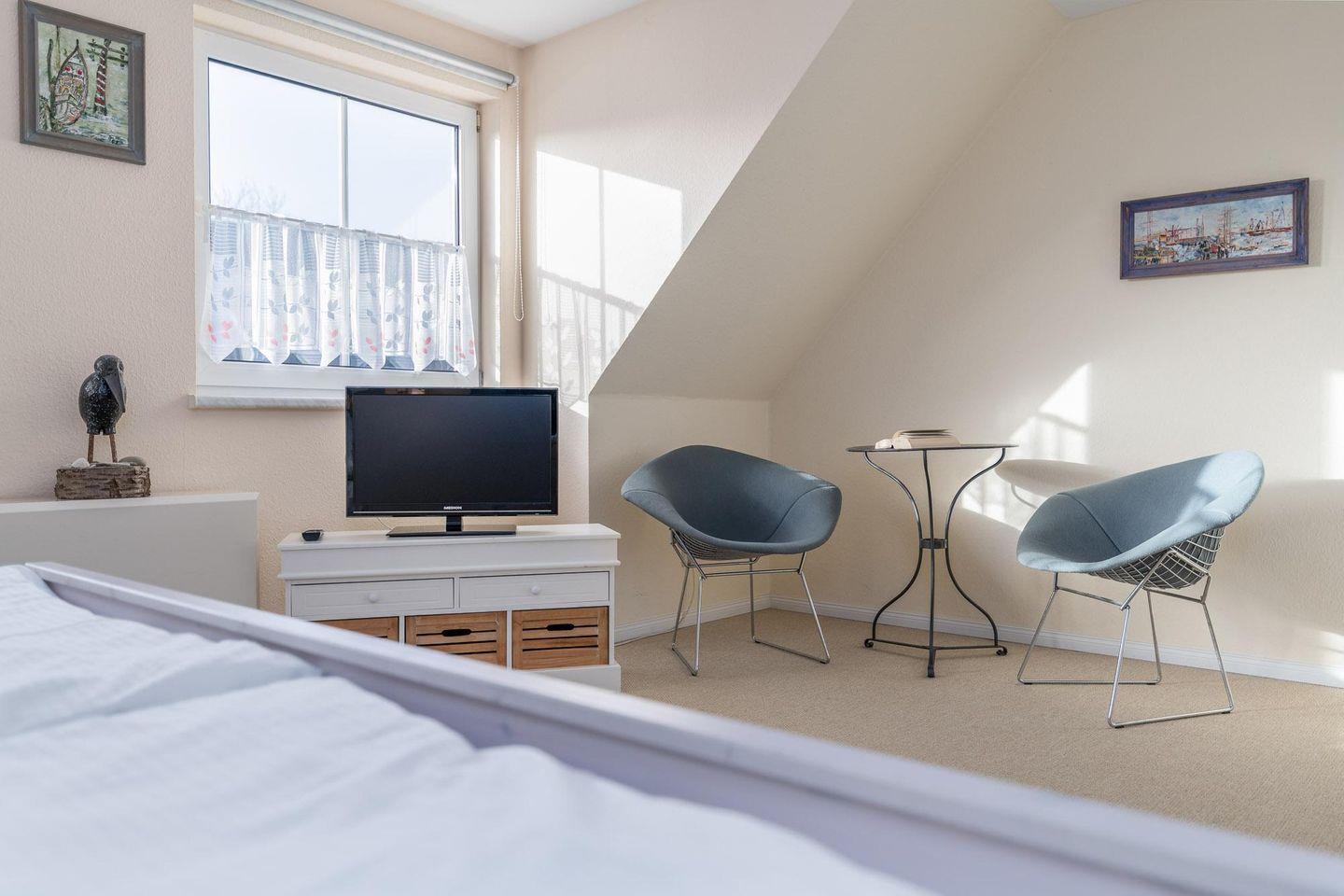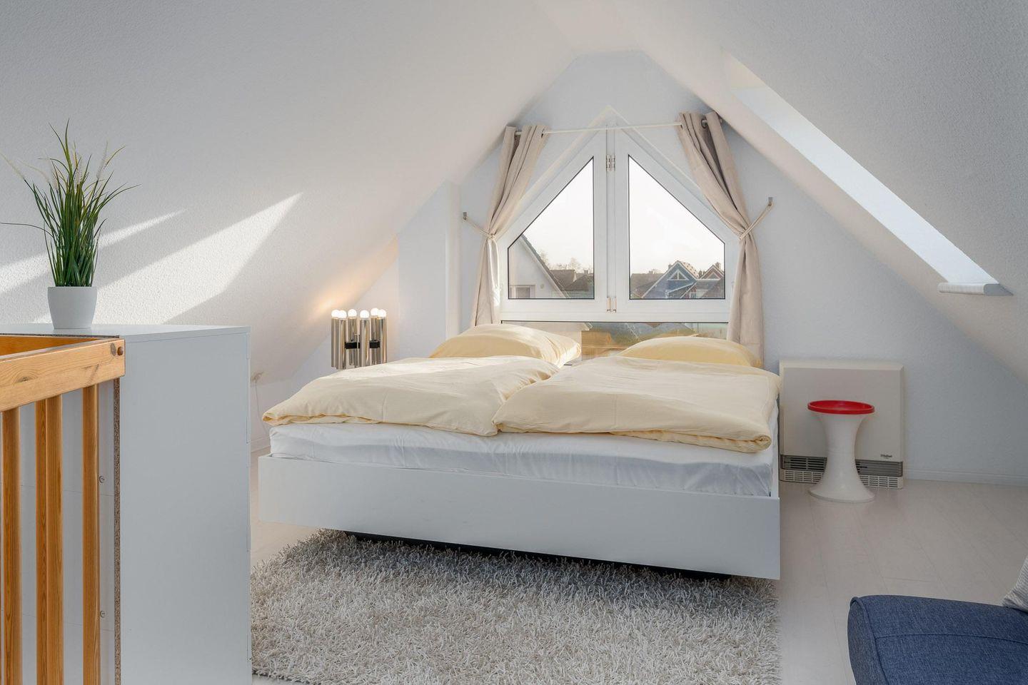 Im Schlafzimmer der ersten Etage befinden sich ein Doppelbett (zwei Matratzen mit 180 x 200 cm Topper), ein Kleiderschrank, ein kleiner Wäscheschrank, ein Standspiegel, ein kleiner TV (Satellitenanlage) sowie ein kleiner Bistrotisch mit zwei Sesseln für die kleine Pause zwischendurch. Im kleineren Zimmer der ersten Etage erwarten Sie ein Einzelbett mit den Maßen 100 x 200 cm und eine Kommode. Im anderen, etwas größeren Zimmer sorgen ein Doppelbett (140 x 200 cm), zwei Kommoden und Leselämpchen am Bett für eine gelungene Nachtruhe. In der Galerie der Dachspitze integriert ist ein lauschiges Schlafzimmer mit Doppelbett (180 x 200 cm/ zwei Matratzen/ einzelne Topper), Sideboard, verdunklungsfähigen Dachflächenfenstern und Giebelfenster mit Vorhang. Ein Wäscheset kann pro Person kostenpflichtig zugebucht werden.