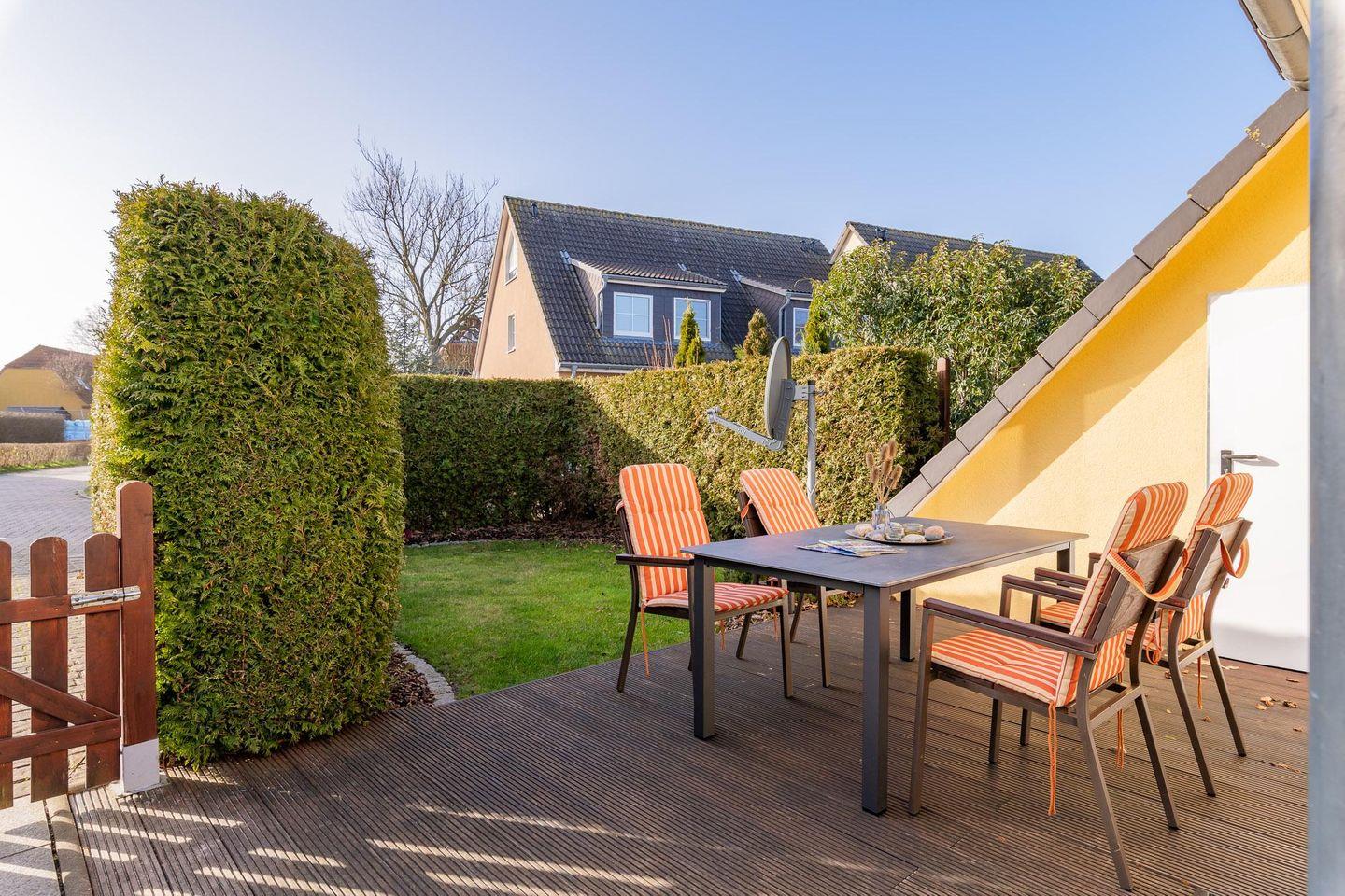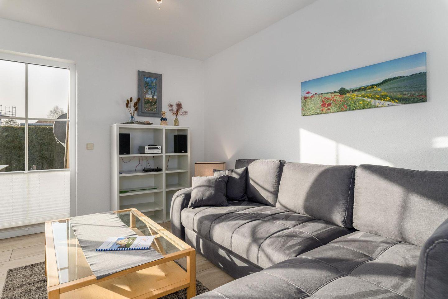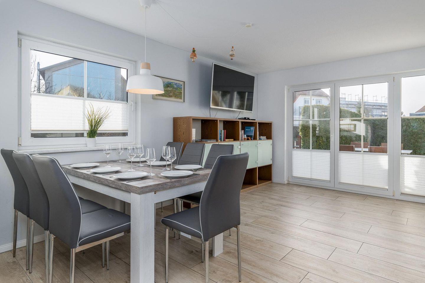 Das lichtdurchflutete Wohnzimmer mit großzügiger Eck-Couch und einem Ausziehtisch ist optimal für bis zu sieben Personen eingerichtet. Ein 55 Zoll Flatscreen und eine kleine Kompakt-HiFi-Anlage (externe Medien anschließbar) sorgen für bunte Unterhaltung. Von hier gelangen Sie auf die Terrasse. Dort lädt eine Ausstattung mit Möbeln, Sonnenschirm und vorhandenem Holzkohlegrill zu bunten Sommerabenden ein. Die Außenanlage wurde Ende 2021 komplett neugestaltet.