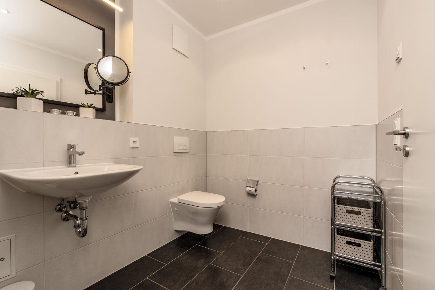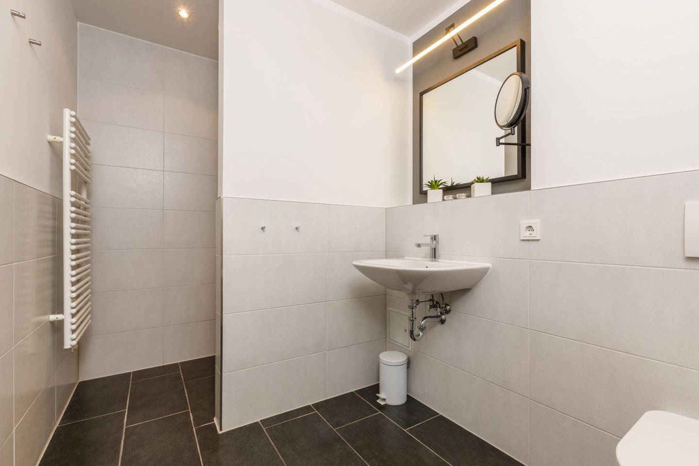 Das schöne Duschbad ist mit bodengleicher Dusche und Handtuchtrockner