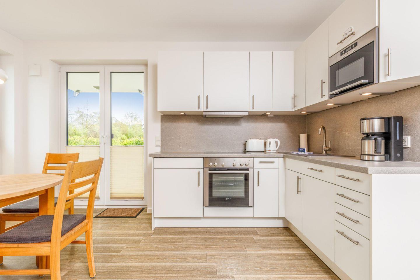 eine Mikrowelle, ein Cerankochfeld, ein Backofen, eine Kaffeemaschine, ein