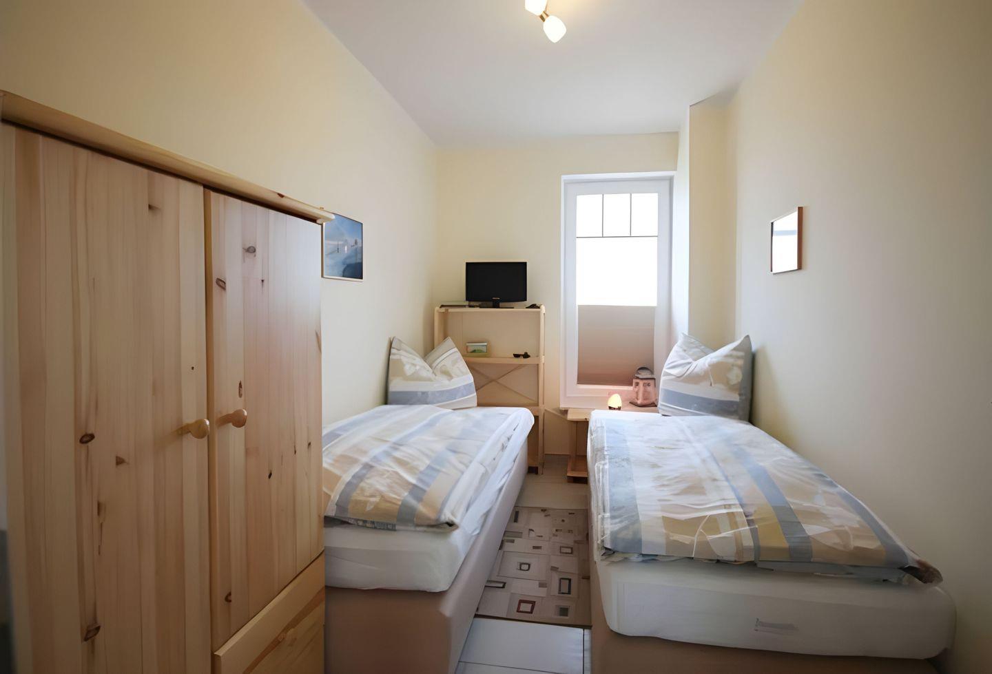 In einem der beiden SCHLAFZIMMER befinden sich zwei Einzelbetten und ein TV-Gerät. Im zweiten Schlafzimmer steht ein komfortables Doppelbett für Sie bereit. Ein DUSCHBAD mit Handtuchtrockner und Föhn, gehört selbstverständlich auch zu der Ferienwohnung.