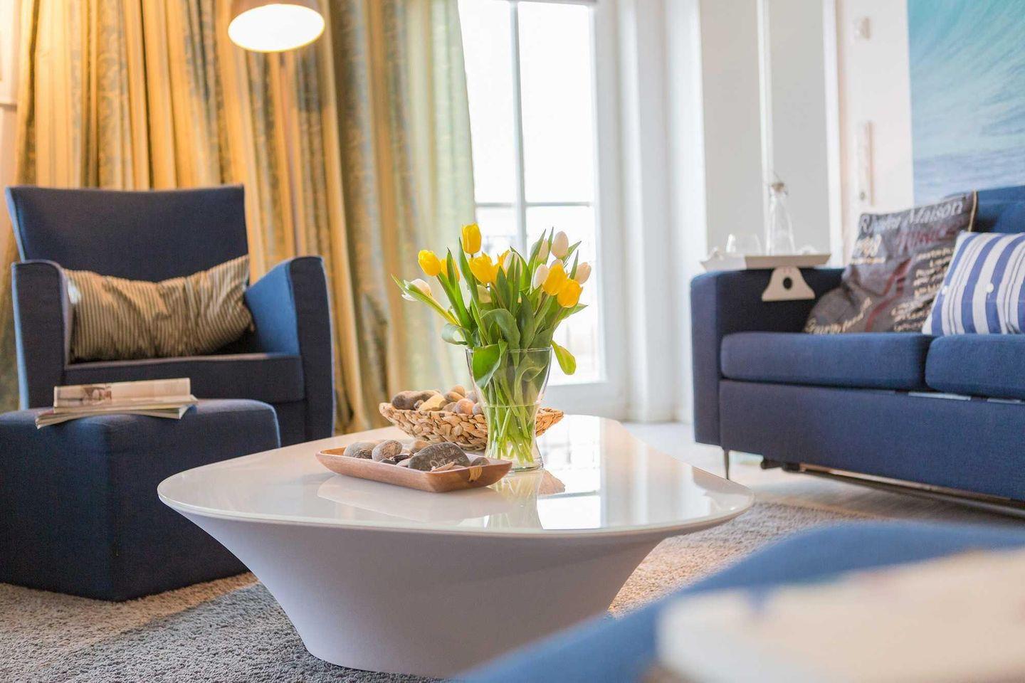 Das maritim eingerichtete Wohnzimmer verfügt über einen HD-Flatscreen-TV, einen