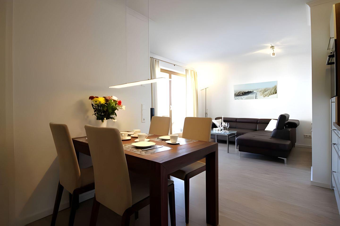 Im geschmackvoll eingerichteten WOHNZIMMER erwarten Sie eine große Eck-Couch, ein Flatscreen-TV, ein DVD-Player und ein Radio. Von hier aus haben Sie direkten Zugang zum BALKON mit Tisch und vier Stühlen. In herrlicher Ost-Ausrichtung begrüßen Sie hier die Morgensonne und klarer Küstenluft. In der voll ausgestatten KÜCHE finden Sie alles, was Sie für Ihren Aufenthalt benötigen. Im Essbereich lädt ein großer Tisch mit vier bequemen Stühlen zum Verweilen ein.