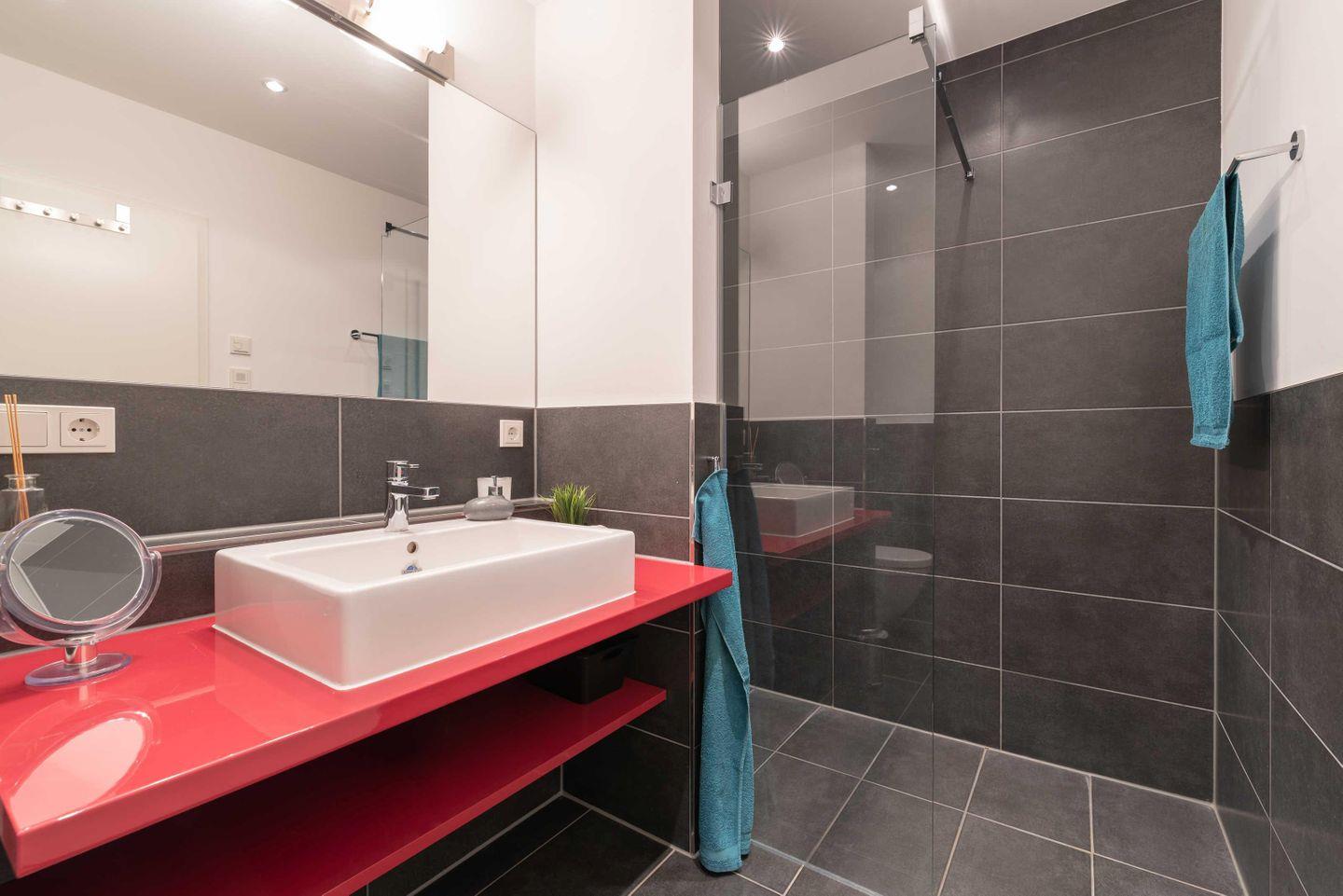 Kosmetikspiegel, einer ebenerdigen Dusche und einem Handtuchheizkörper