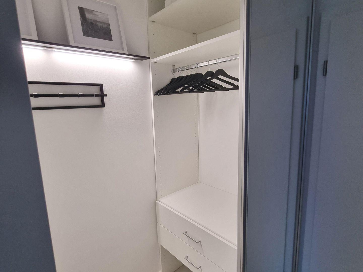 Smart-TV, zwei Nachttische, ein Sitzhocker und ein begehbarer Einbauschrank.