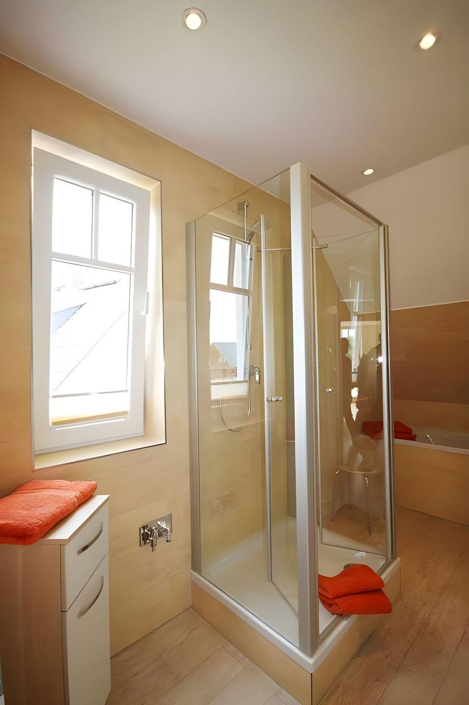 In einem SCHLAFZIMMER befinden sich zwei Einzelbetten und ein TV-Gerät. Dazu ein geräumiger Kleiderschrank. Im zweiten Schlafzimmer steht ein komfortables Doppelbett für Sie bereit. Die Ferienwohnung hat ein DUSCHBAD mit BADEWANNE. Dort finden Sie einen Handtuchtrockner und einen Föhn.