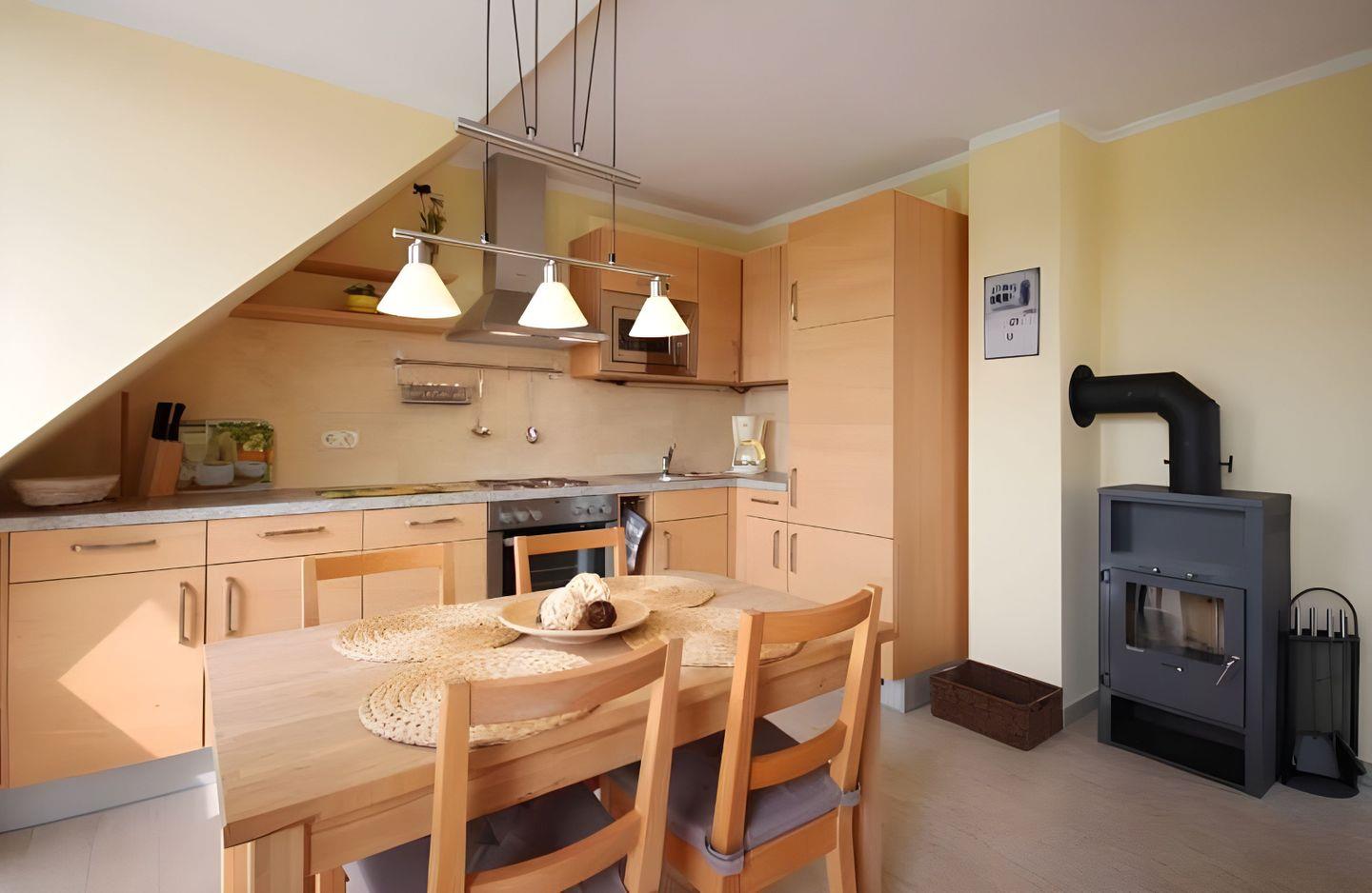 Der lichtdurchflutete WOHN- UND ESSBEREICH bietet 4 Personen an einem großen Holztisch Platz zum Essen oder für unterhaltsame abendliche Spiele mit der Familie. Die voll ausgestattete EINBAUKÜCHE mit einem 4-Cerankochplatten-Herd, Kühlschrank inklusive Gefrierfachs, Mikrowelle, Toaster, Wasserkocher und Filterkaffeemaschine ausgestattet.
