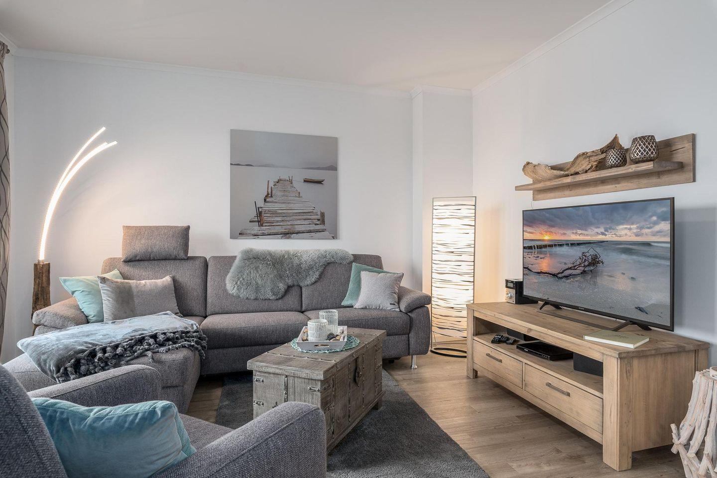 Die geschmackvoll eingerichtete Ferienwohnung befindet sich im ersten Obergeschoss der Villa Sanddorn und bietet Platz für drei Personen. Der WOHNRAUM verfügt über eine große, bequeme Eck-Couch, einen Sessel, einen TV und eine Stereoanlage. An kühlen Tagen schafft der HOLZKAMIN wohlige Wärme und ein reizvolles Flammenspiel (Brennholz ist selbst mitzubringen.)