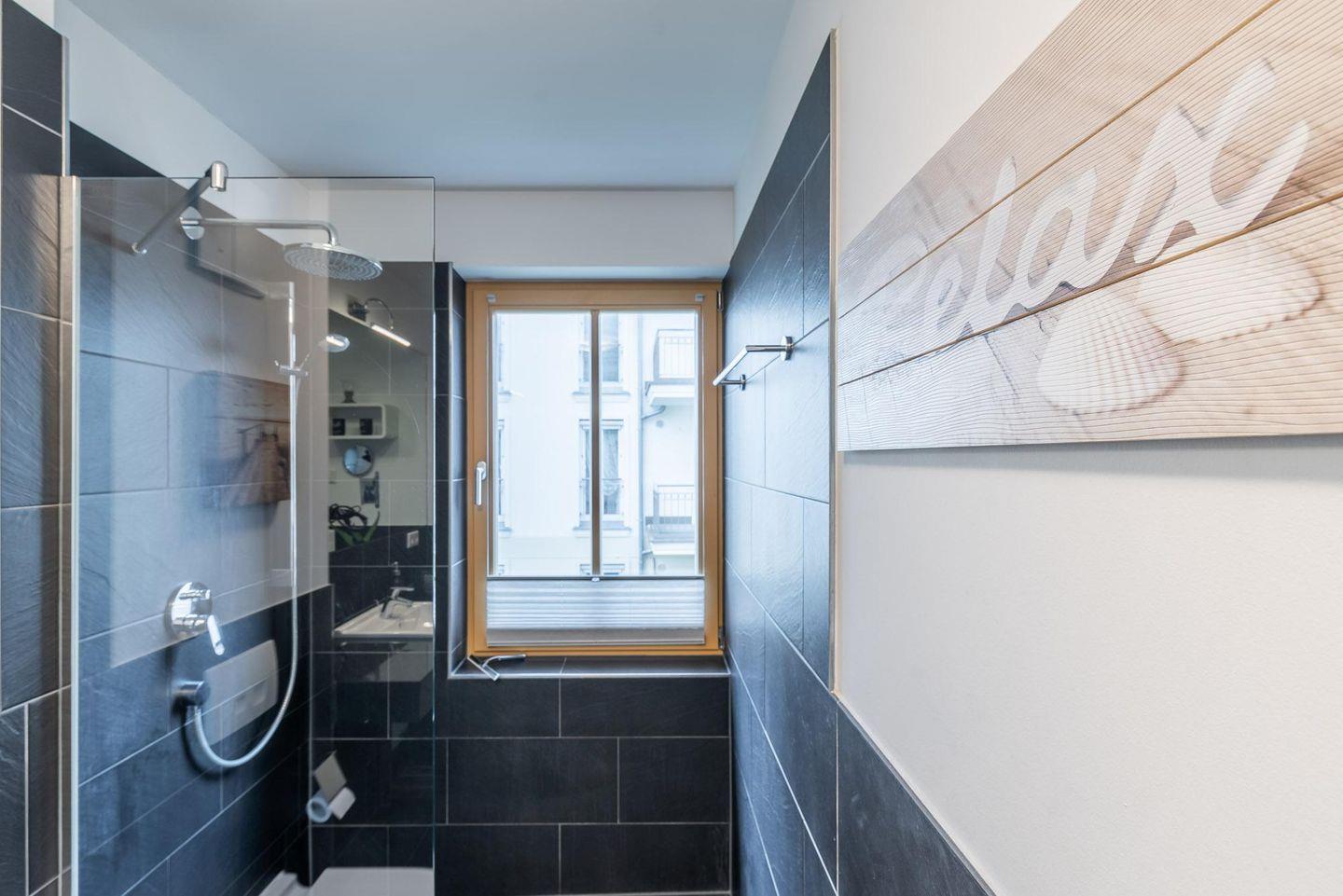 Das elegante BAD besitzt eine bodengleiche Dusche, einen großzügigen Waschtisch sowie einen Spiegel, Der sich an die Breite des Waschtischs anpasst. Zu der Ferienwohnung gehört ein KOSTENFREIER AUSSENSTELLPLATZ (ca. 30 m vom Objekt entfernt). Am Eingang zur Villa befinden sich zudem FAHRRADSTÄNDER. Der im Gebäude installierte Aufzug erleichtert den Transport der mitgebrachten Koffer. Die Unterkunft ist komplett mit einer Fußbodenheizung versehen worden.
