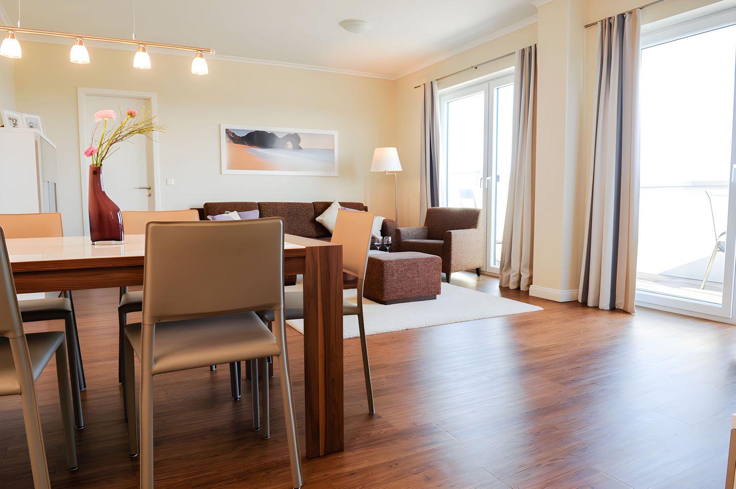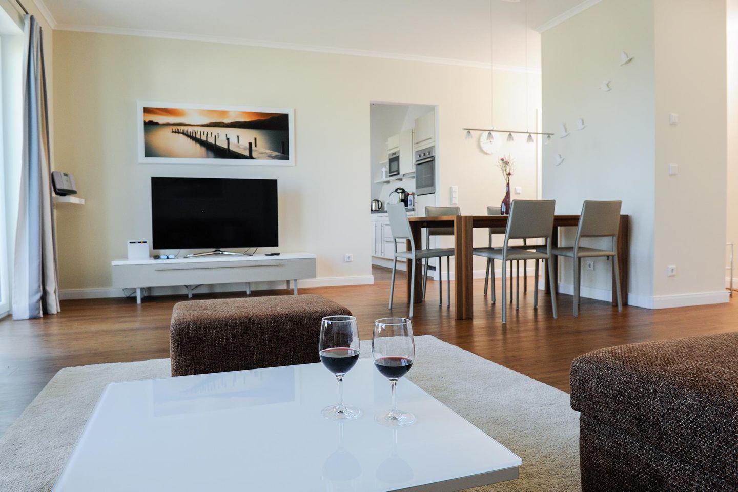 Großes Wohn- und Esszimmer mit Zugang zum großen Balkon, Esstisch mit Lederstühlen, Couchgarnitur mit Doppelbettfunktion, großes LED 3D-TV-Gerät (55“), Blu-ray Player mit attraktiver 3D-DVD-Sammlung, Radio/Disc-Player, kostenfreiem Internetanschuss, Spielesammlung und vielfältiger Buch- und CD-Auswahl