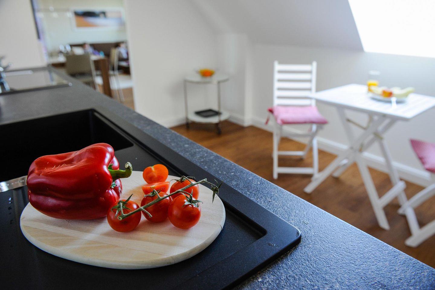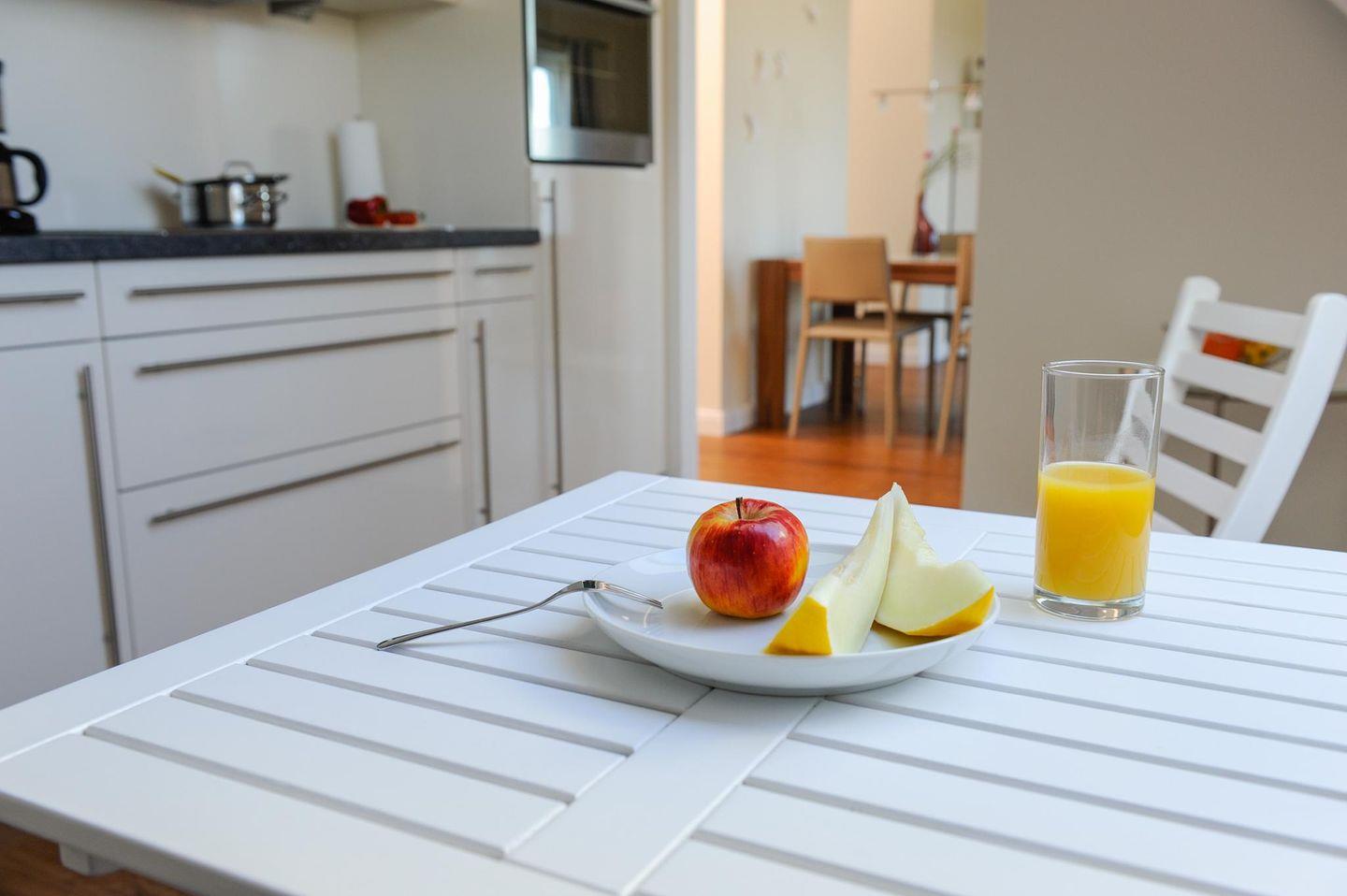 Offene Einbauküche mit Backofen/Herd, Geschirrspüler, Kühlschrank mit Gefrierfach, Kaffeemaschine, Tchibo „Cafissimo“ Kaffeekapselmaschine, Saftpresse, Wasserkocher, Toaster, Mikrowelle